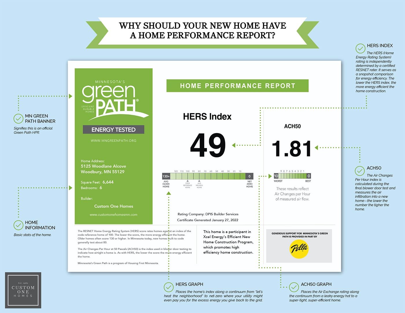 This is an example of a Home Performance Report (HPR) which offers an in-depth look at a home’s energy efficiency, as measured by the HERS Index. Custom One Homes’ average score of 50 indicates exceptional energy performance, making our homes significantly more efficient than both new and resale homes on the market.