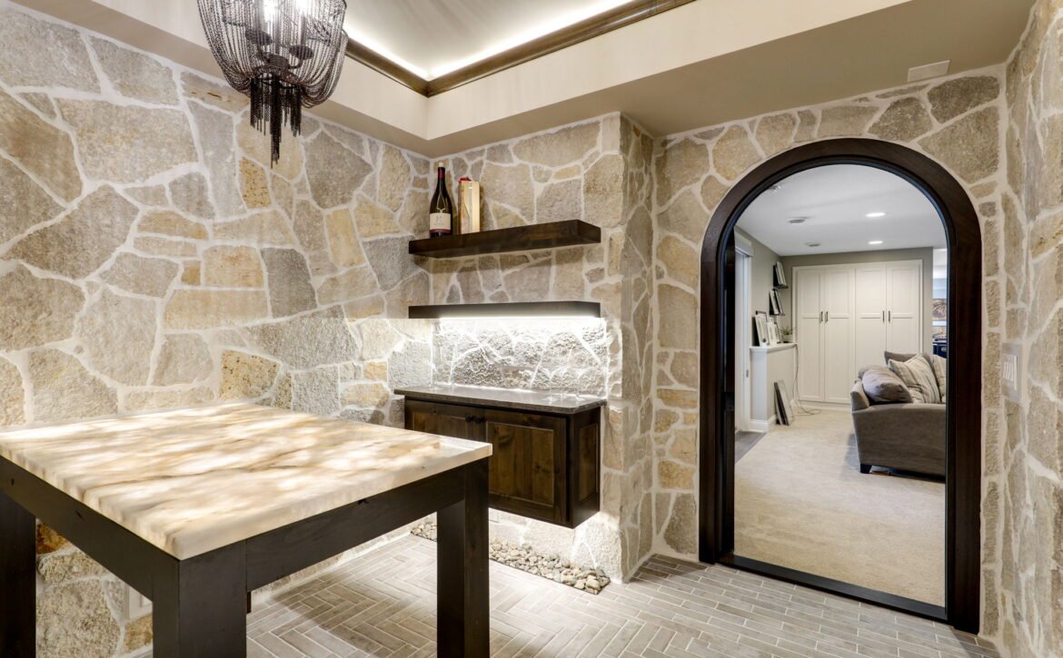 A custom LED-backlit granite table serves as the room’s centerpiece, blending style with practicality for tastings and gatherings.