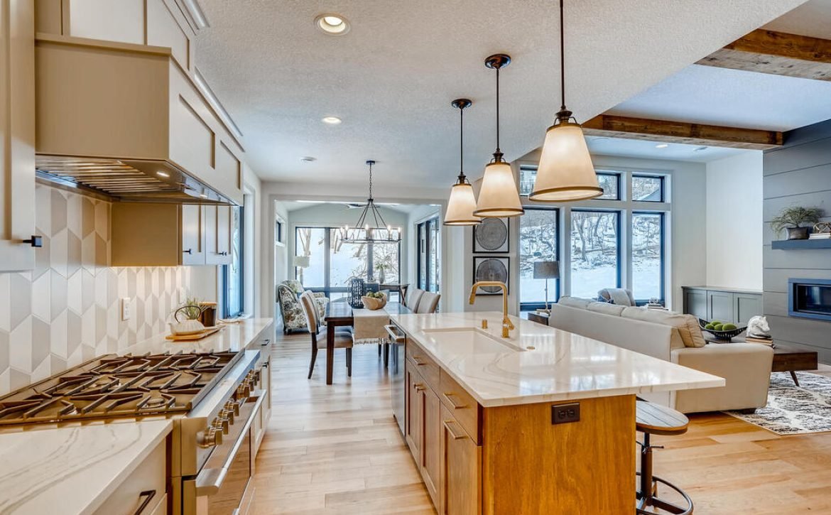 This four bedroom, four bathroom home is located in the Royal Club neighborhood of Lake Elmo, MN and features a modern rustic style designed by Lisa Robbins of Design Créatif. Overlooking the Royal Club Championship golf course, this home takes luxury to a whole new level with a chef’s kitchen, spa-like owners’ suite, exercise room, and pub-inspired bar. But that’s not all! Every detail of this home was carefully selected to add elements of luxury to the finished design. Here are some of the highlights you’ll see in this home.