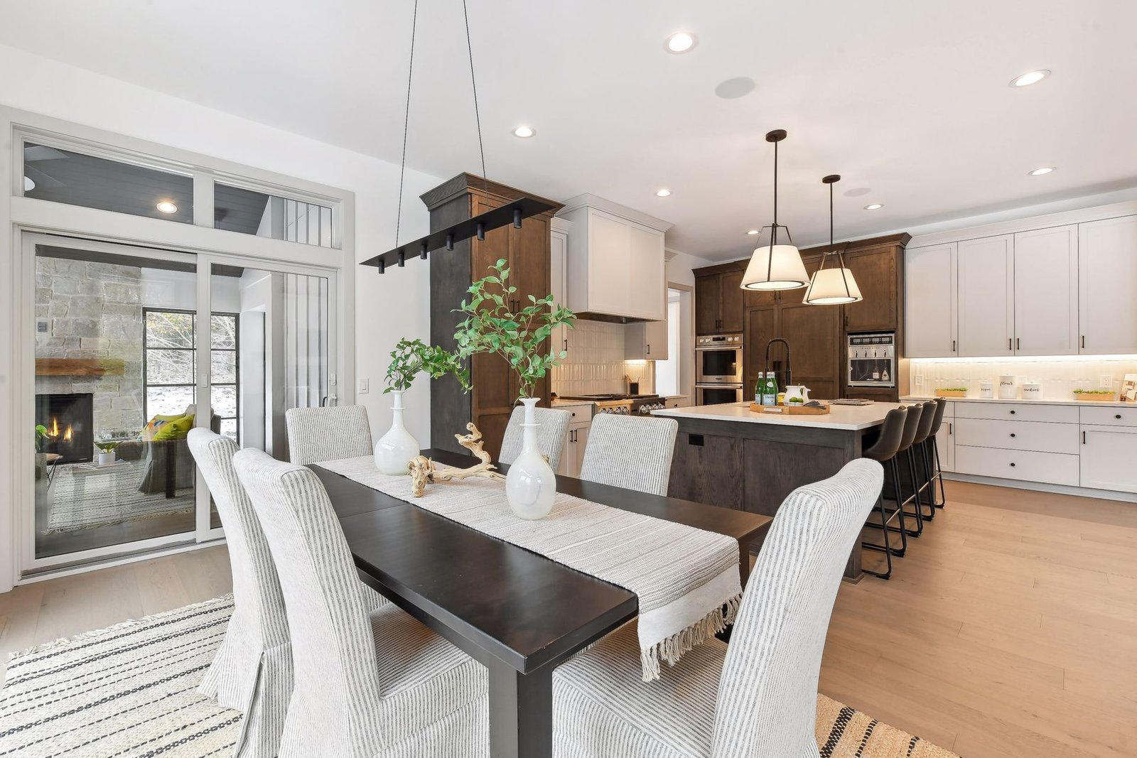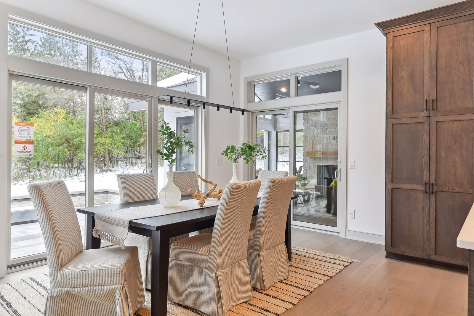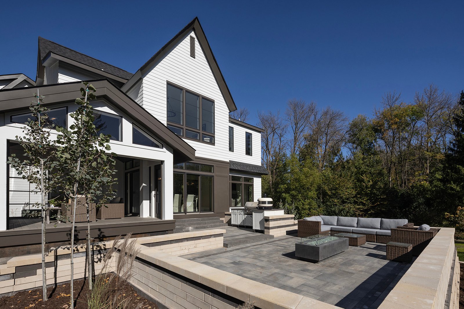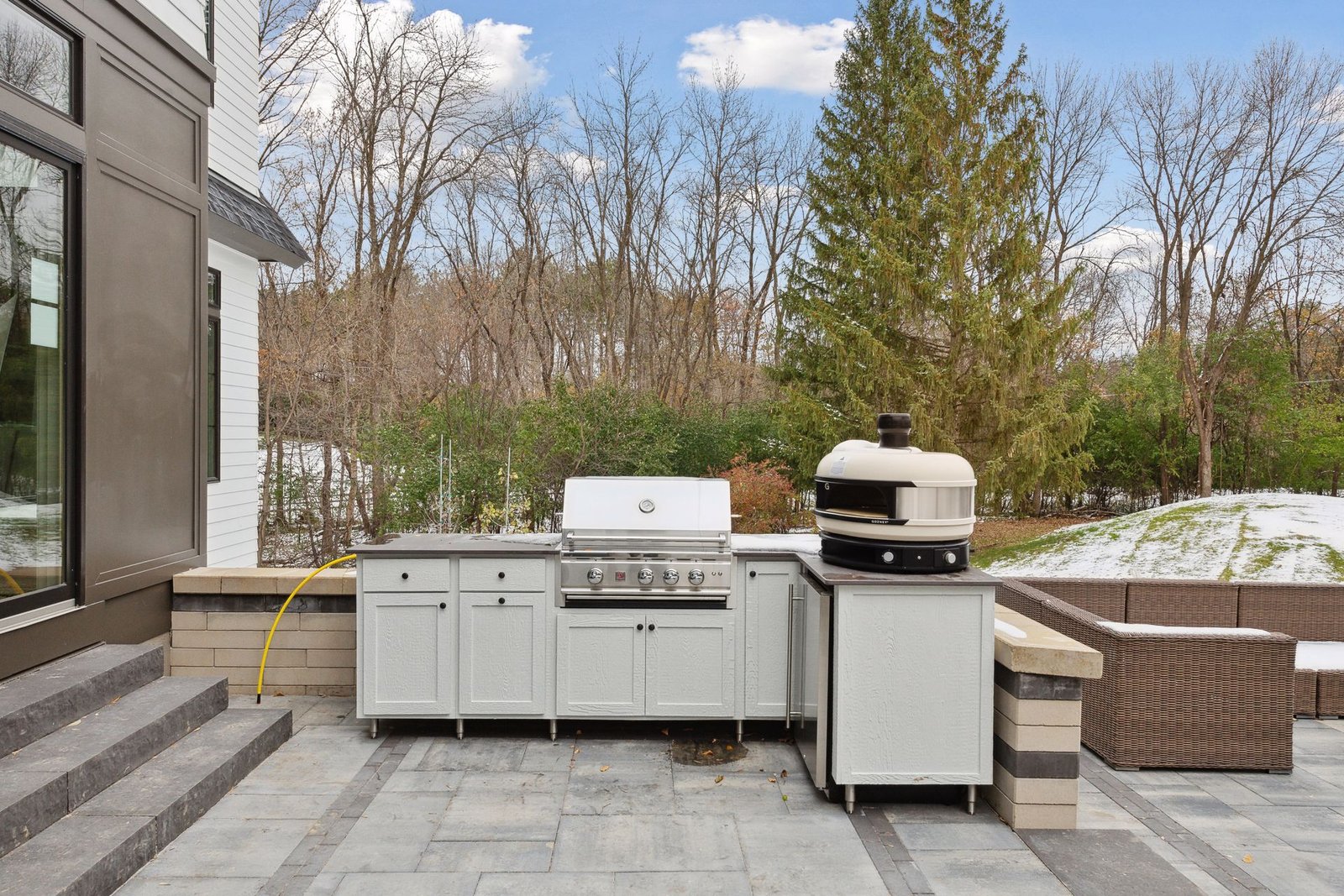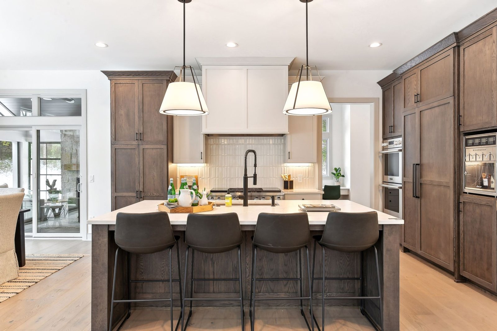 Inside, the home boasts exceptional sliding glass doors that open up to the main-level office. These doors flood the space with natural light and offer tranquil views of the surrounding greenery. The spacious, luxurious kitchen is a chef’s dream, complete with top-of-the-line appliances, a butler’s pantry with a built-in coffee machine, and a built-in wine dispenser. Adjacent to the kitchen is a three-season porch, perfect for hosting and entertaining throughout the year. Moreover, the outdoor kitchen area, accessible from the dining room, further enhances the entertainment options.