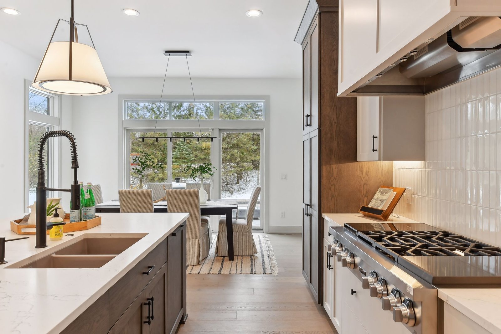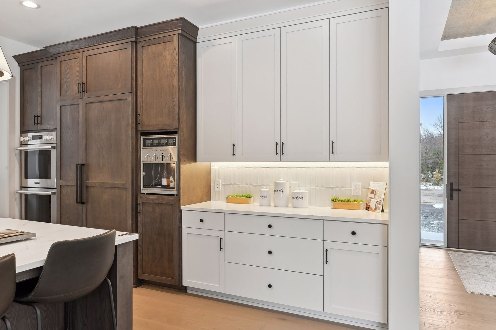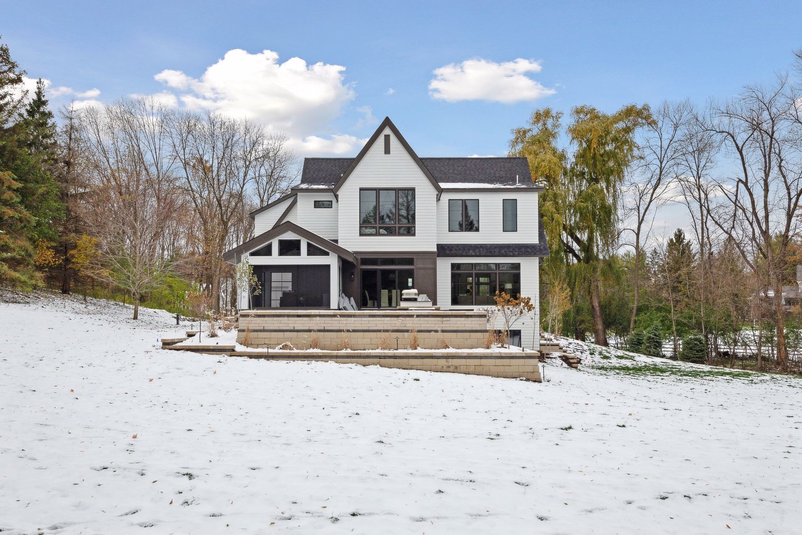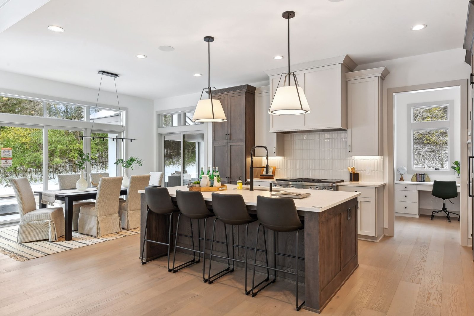 Inside, the home boasts exceptional sliding glass doors that open up to the main-level office. These doors flood the space with natural light and offer tranquil views of the surrounding greenery. The spacious, luxurious kitchen is a chef’s dream, complete with top-of-the-line appliances, a butler’s pantry with a built-in coffee machine, and a built-in wine dispenser. Adjacent to the kitchen is a three-season porch, perfect for hosting and entertaining throughout the year. Moreover, the outdoor kitchen area, accessible from the dining room, further enhances the entertainment options.