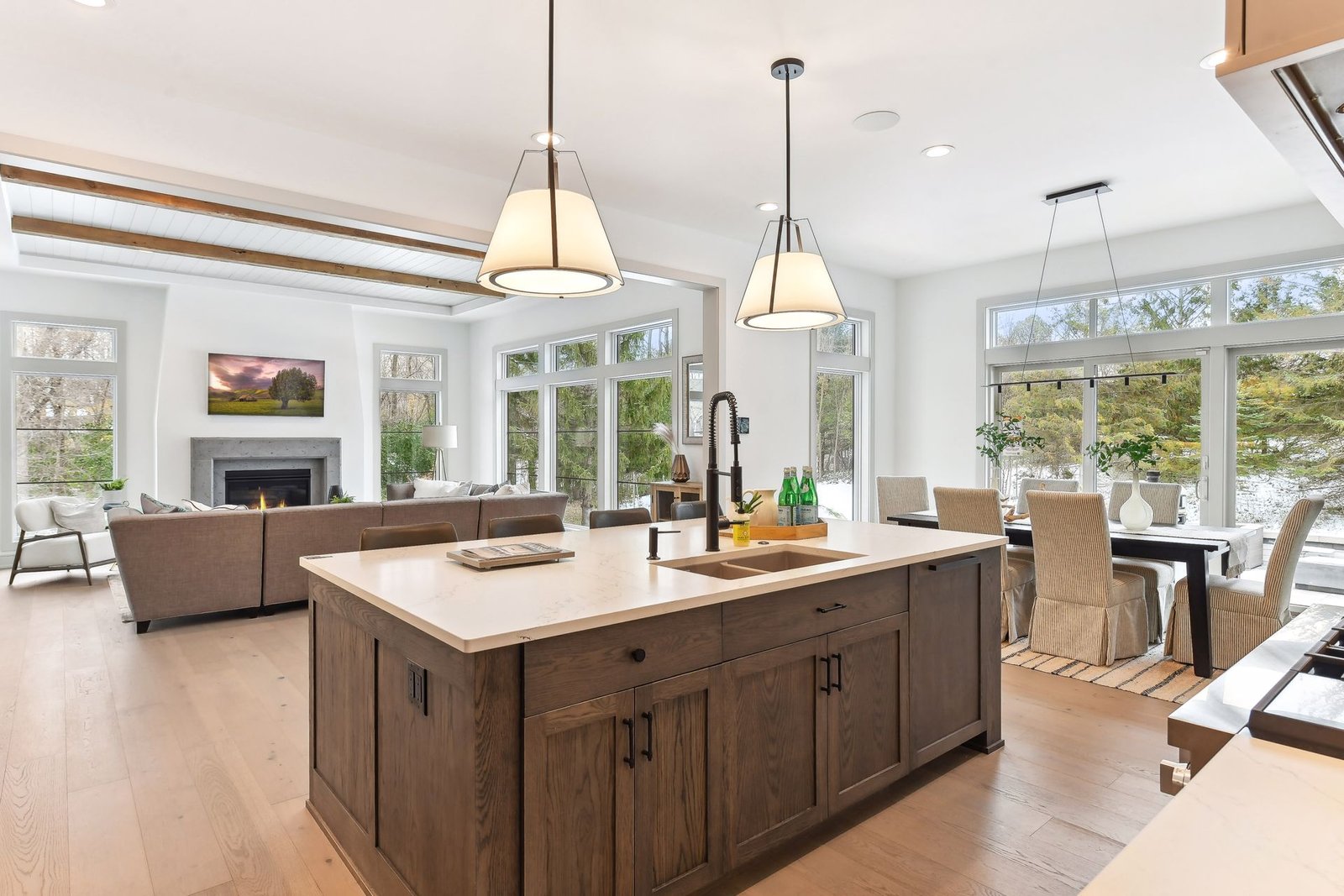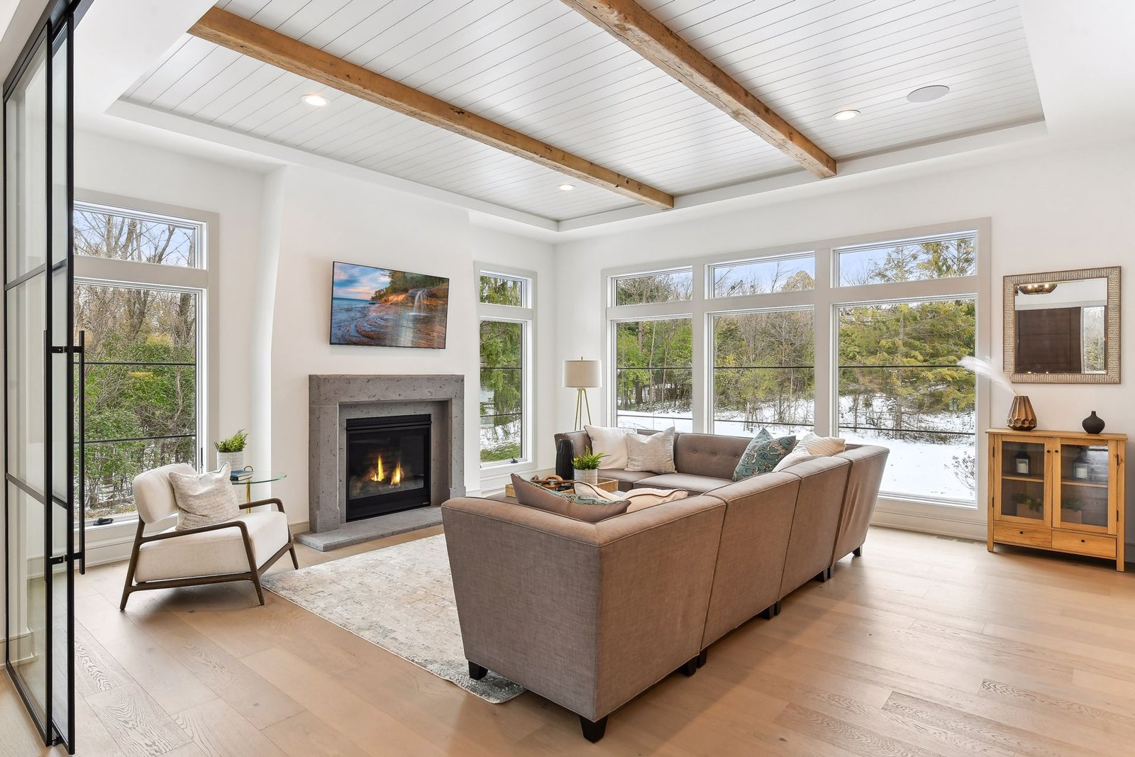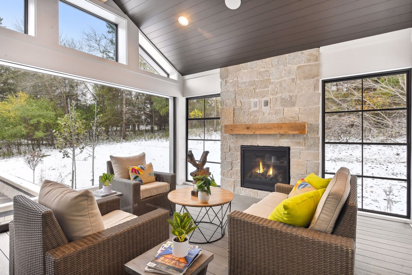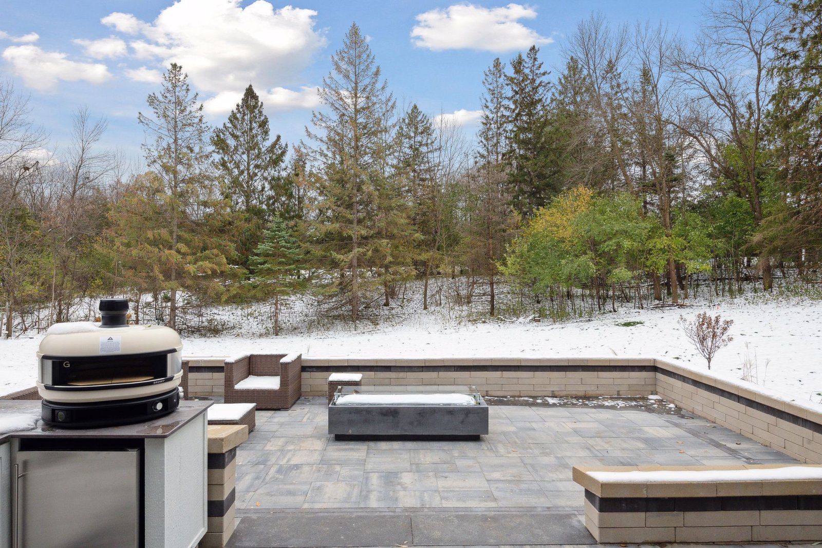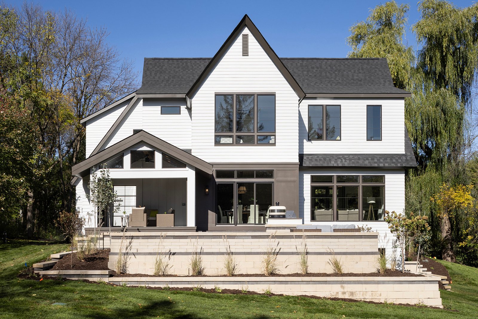 Inside, the home boasts exceptional sliding glass doors that open up to the main-level office. These doors flood the space with natural light and offer tranquil views of the surrounding greenery. The spacious, luxurious kitchen is a chef’s dream, complete with top-of-the-line appliances, a butler’s pantry with a built-in coffee machine, and a built-in wine dispenser. Adjacent to the kitchen is a three-season porch, perfect for hosting and entertaining throughout the year. Moreover, the outdoor kitchen area, accessible from the dining room, further enhances the entertainment options.