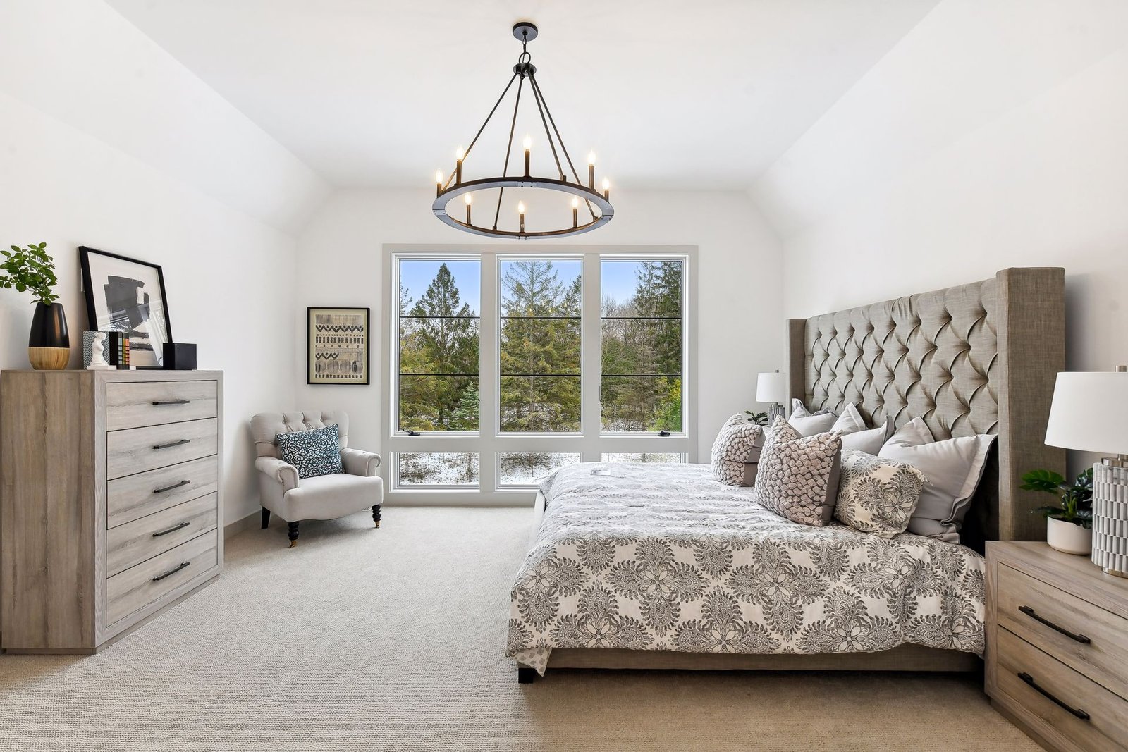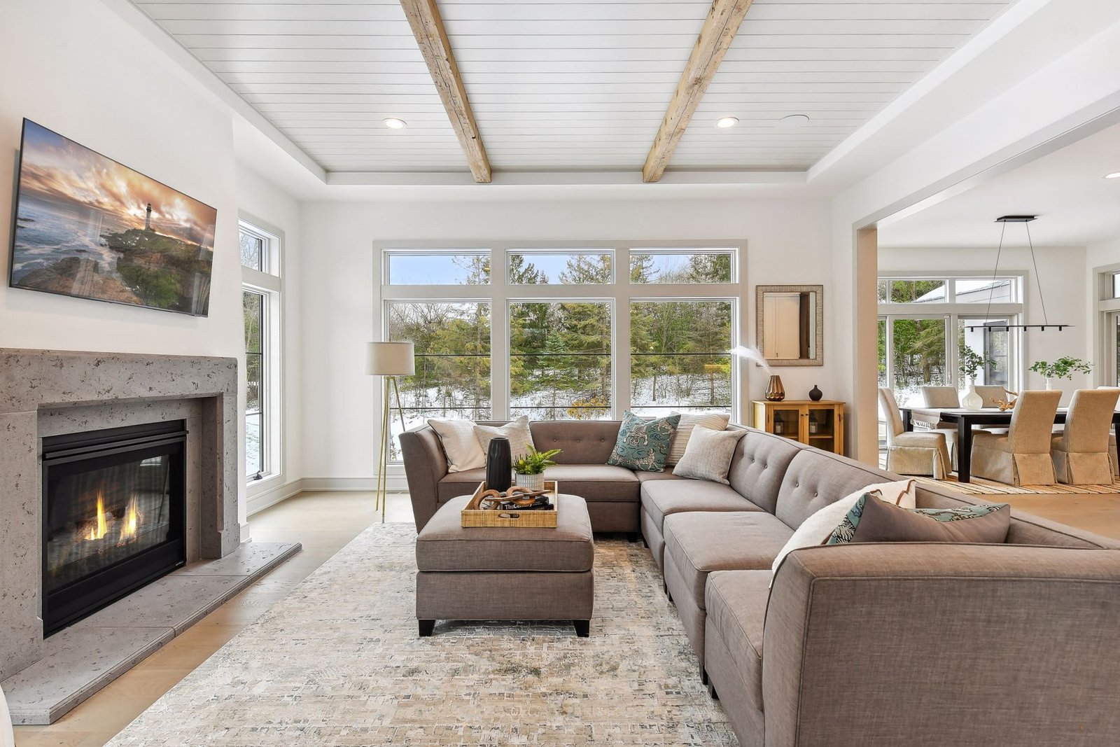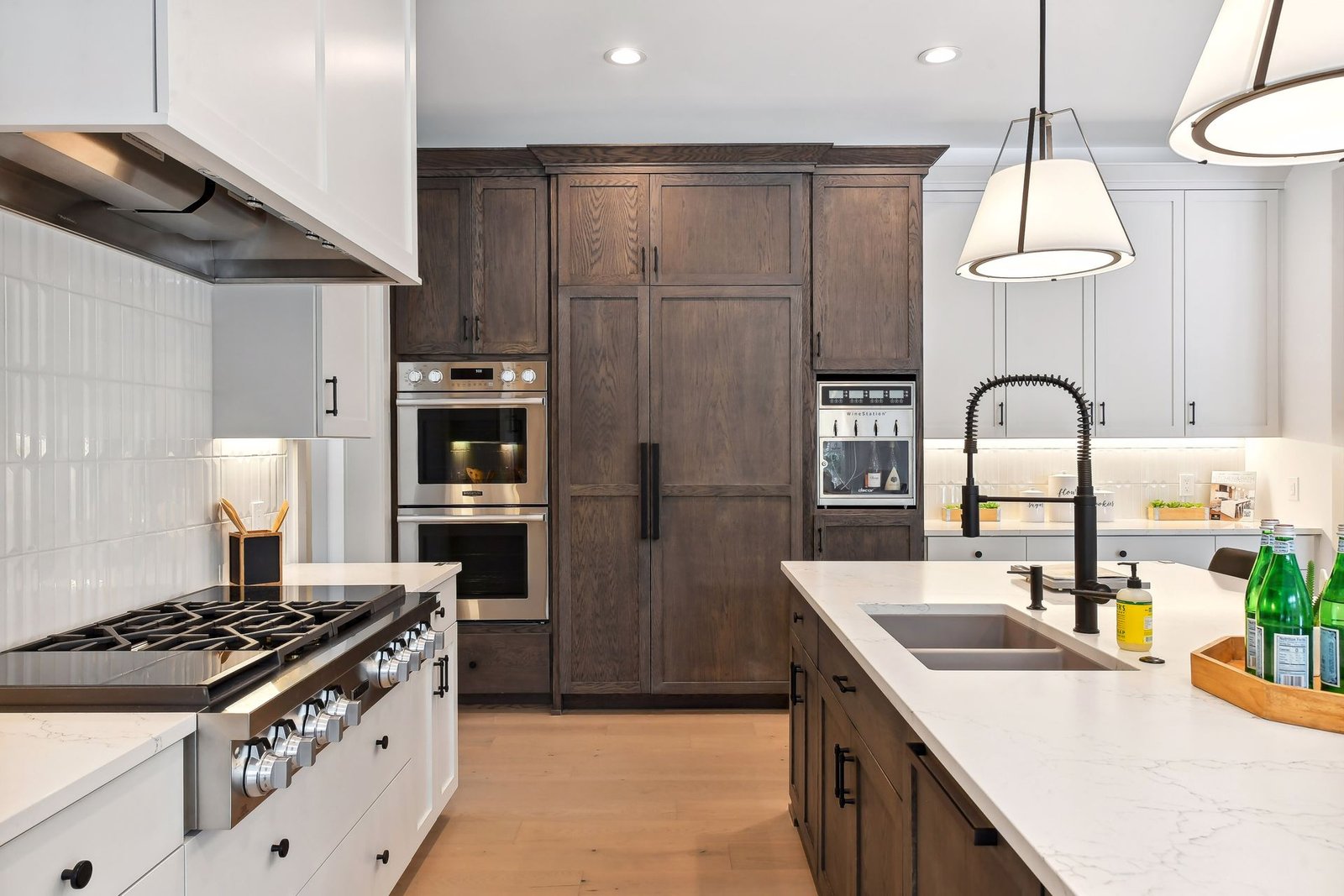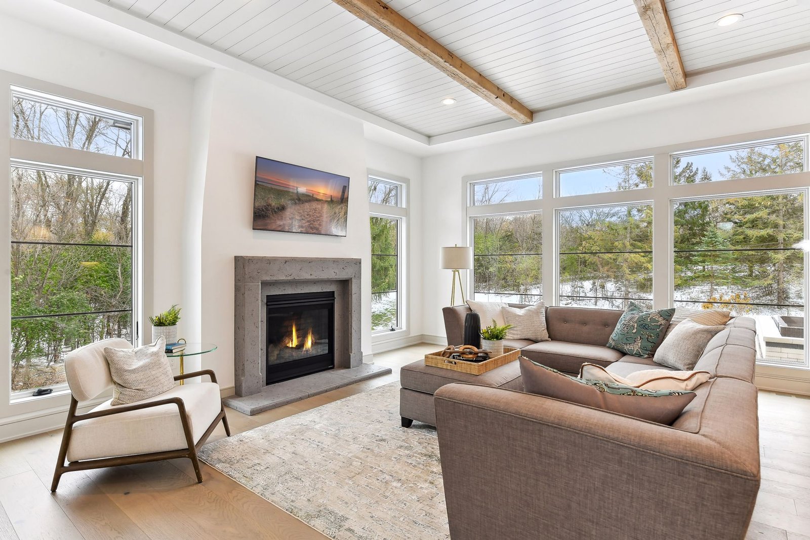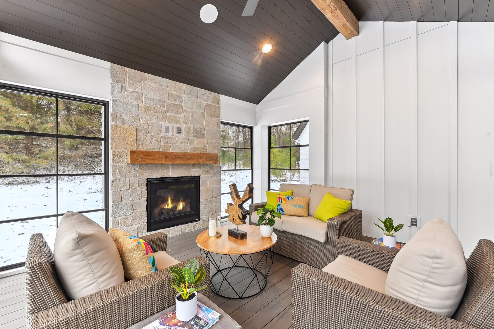 Inside, the home boasts exceptional sliding glass doors that open up to the main-level office. These doors flood the space with natural light and offer tranquil views of the surrounding greenery. The spacious, luxurious kitchen is a chef’s dream, complete with top-of-the-line appliances, a butler’s pantry with a built-in coffee machine, and a built-in wine dispenser. Adjacent to the kitchen is a three-season porch, perfect for hosting and entertaining throughout the year. Moreover, the outdoor kitchen area, accessible from the dining room, further enhances the entertainment options.