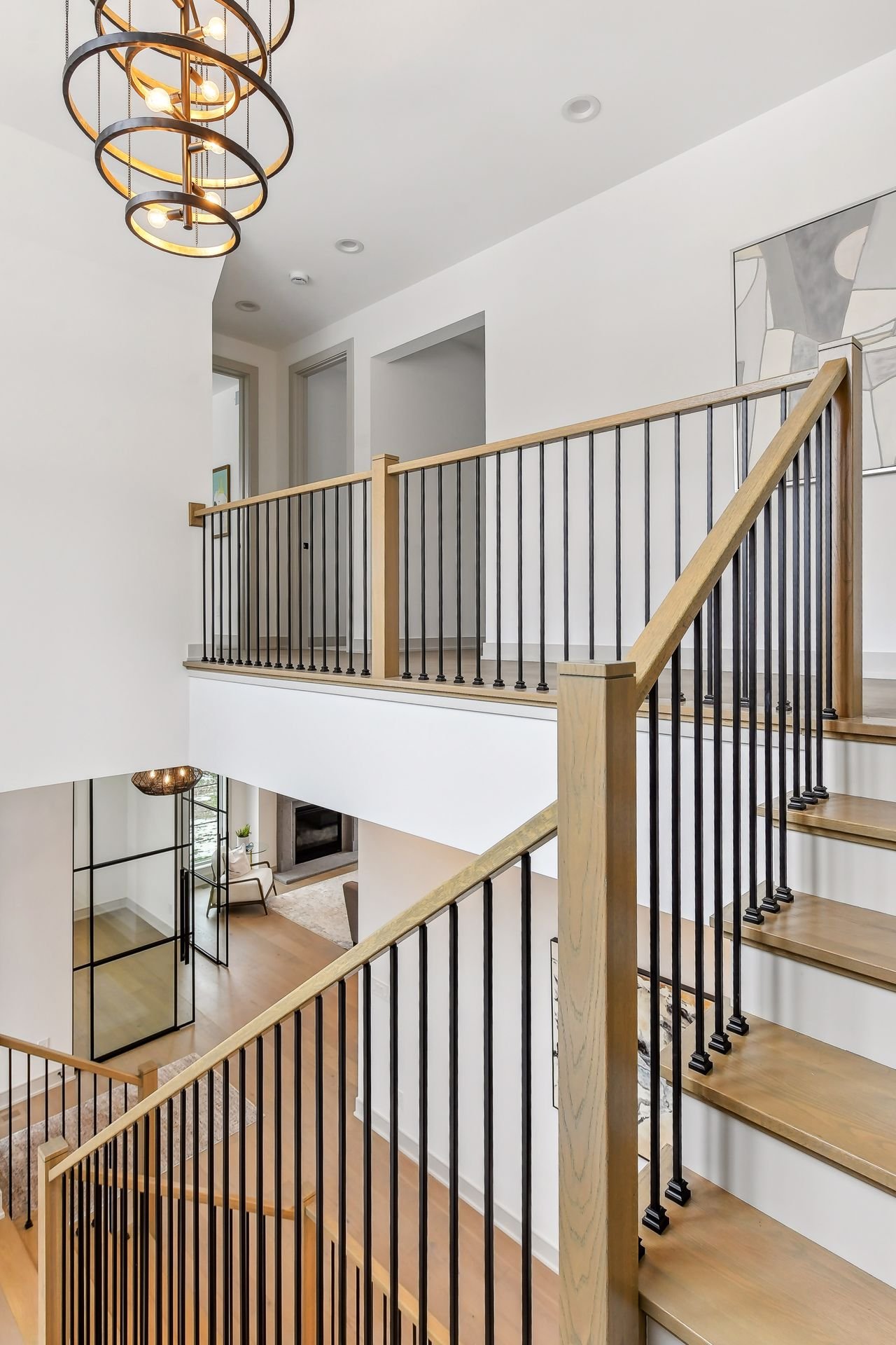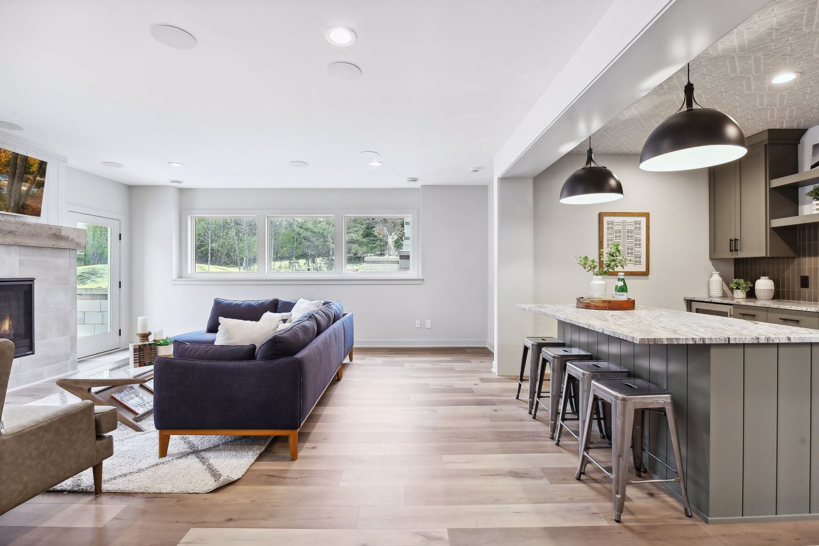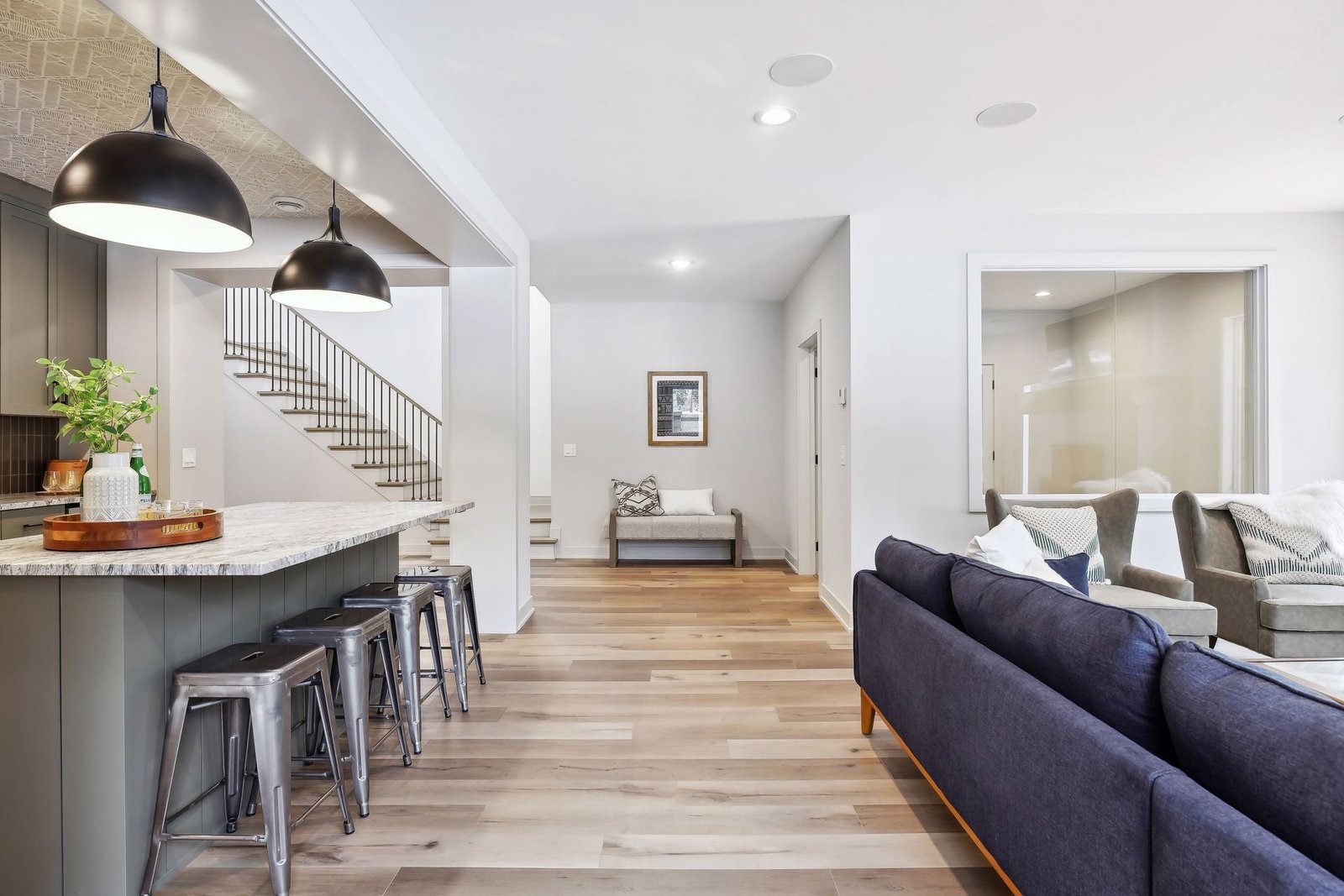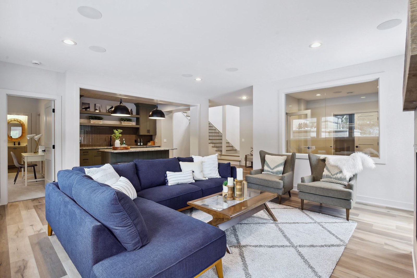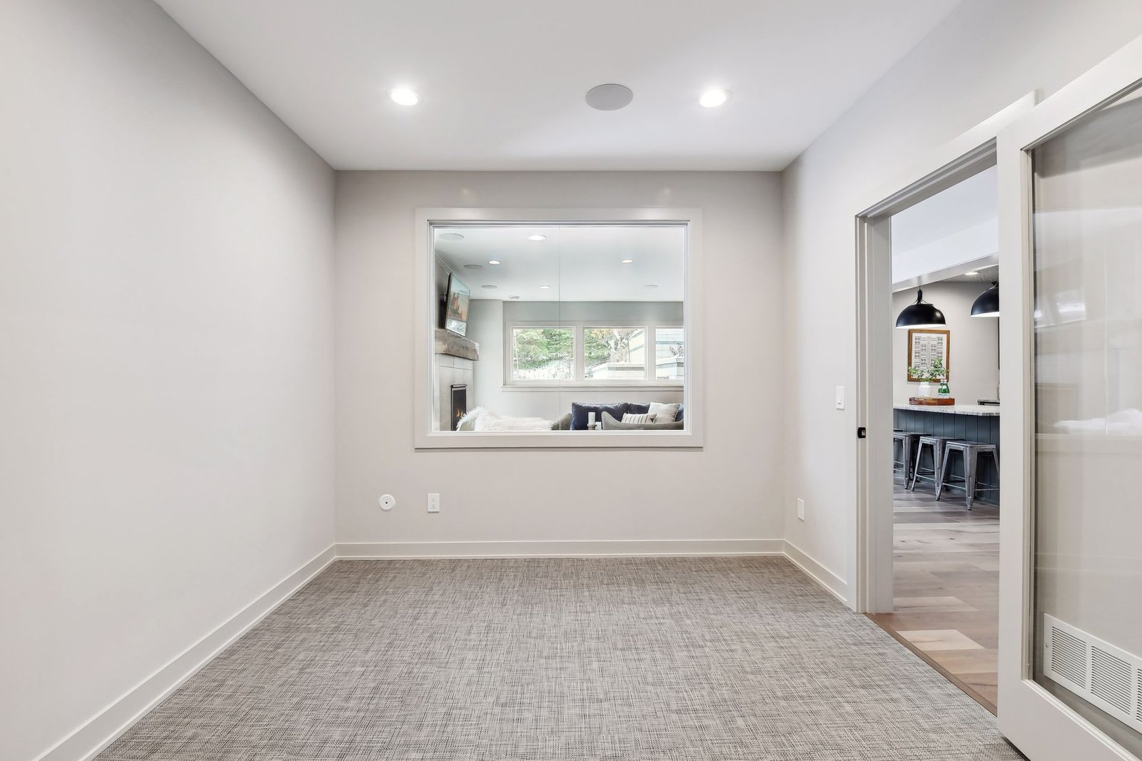 The lower level includes a bar area and a guest room with an en-suite bathroom, ensuring comfort and privacy for visitors. Additionally, there is a dedicated workout space and a spacious lower-level family room, ideal for relaxation and family gatherings.