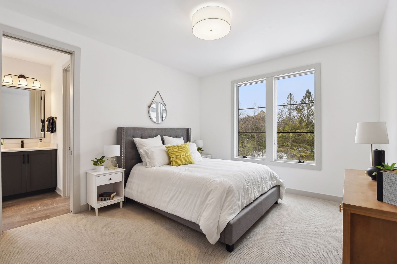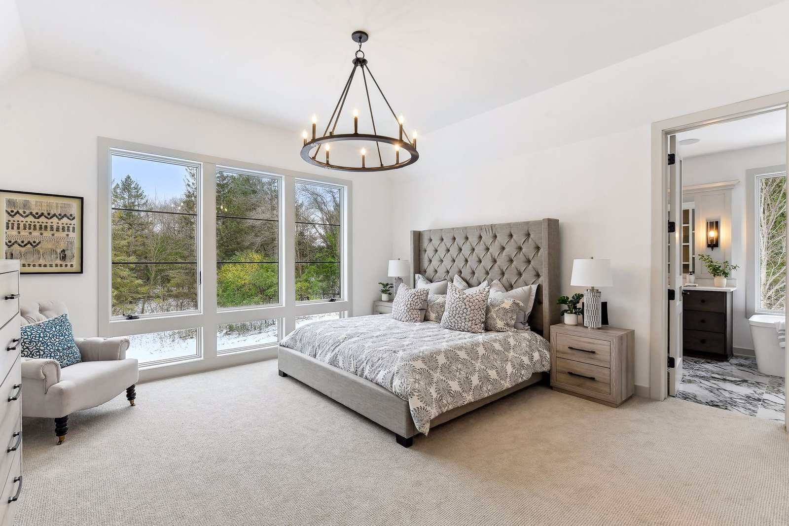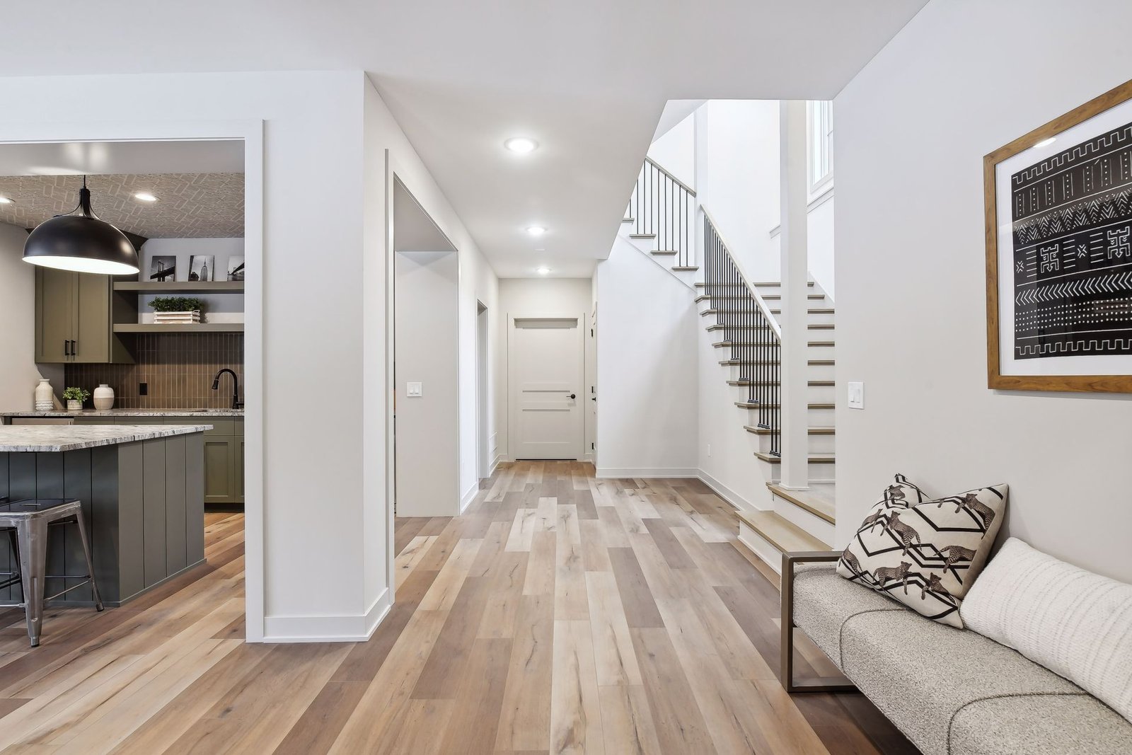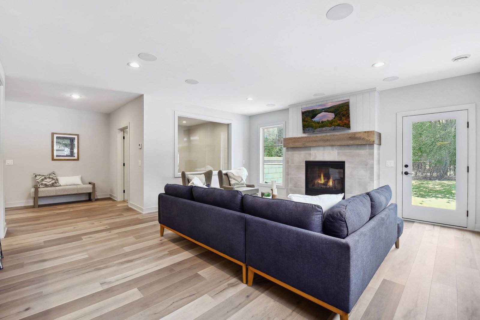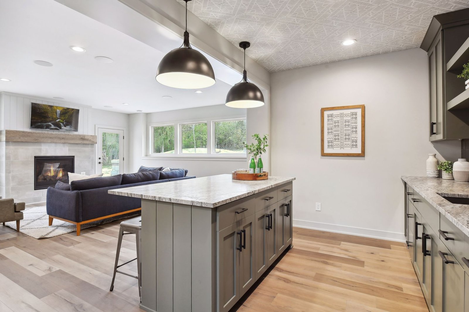 The lower level includes a bar area and a guest room with an en-suite bathroom, ensuring comfort and privacy for visitors. Additionally, there is a dedicated workout space and a spacious lower-level family room, ideal for relaxation and family gatherings.