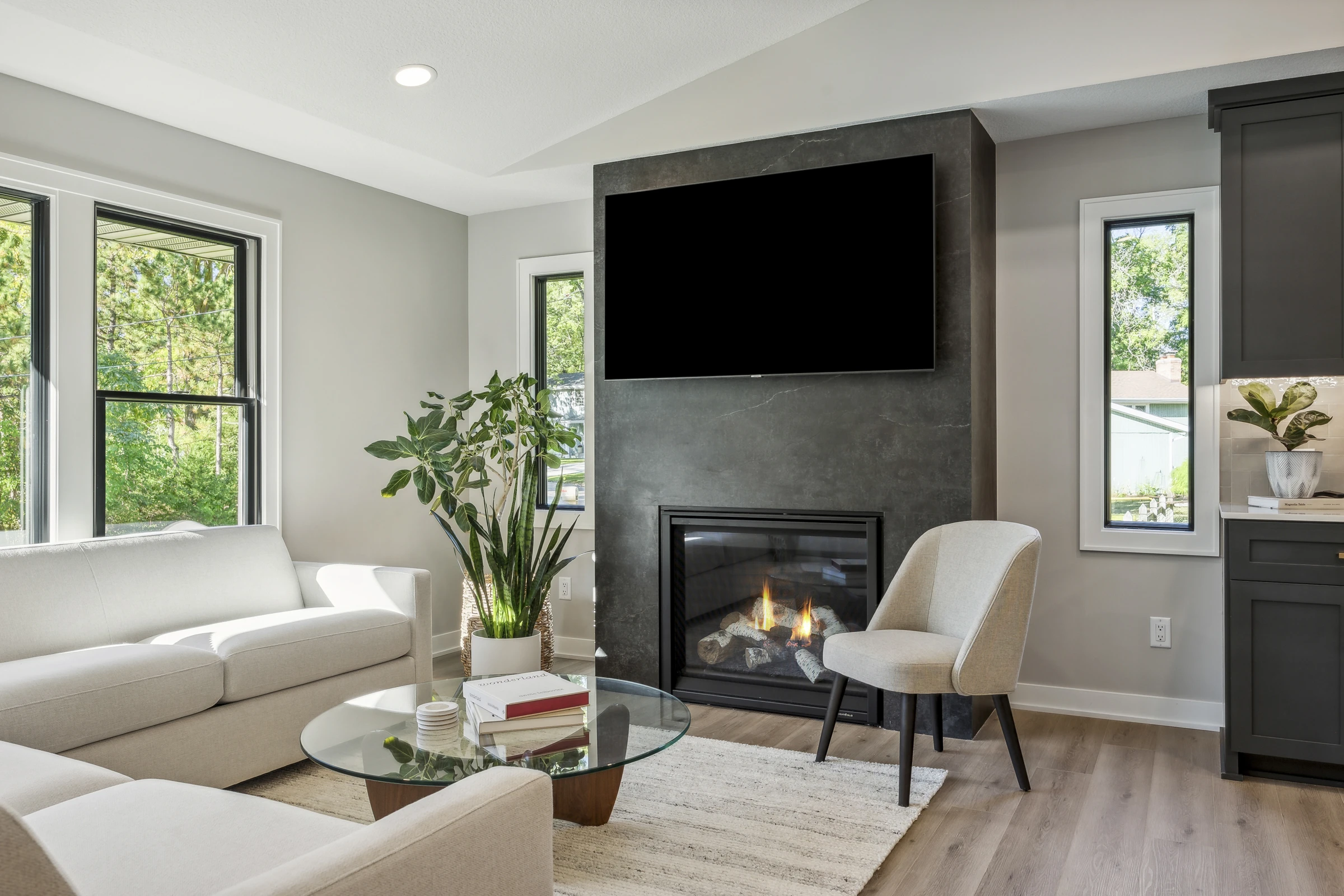 Adjacent to the kitchen, the fireplace was converted to gas and given a modern update with Dekton cladding, creating a sleek yet warm focal point in the living area. This upgrade enhances the cozy ambiance while complementing the home’s modern aesthetic.