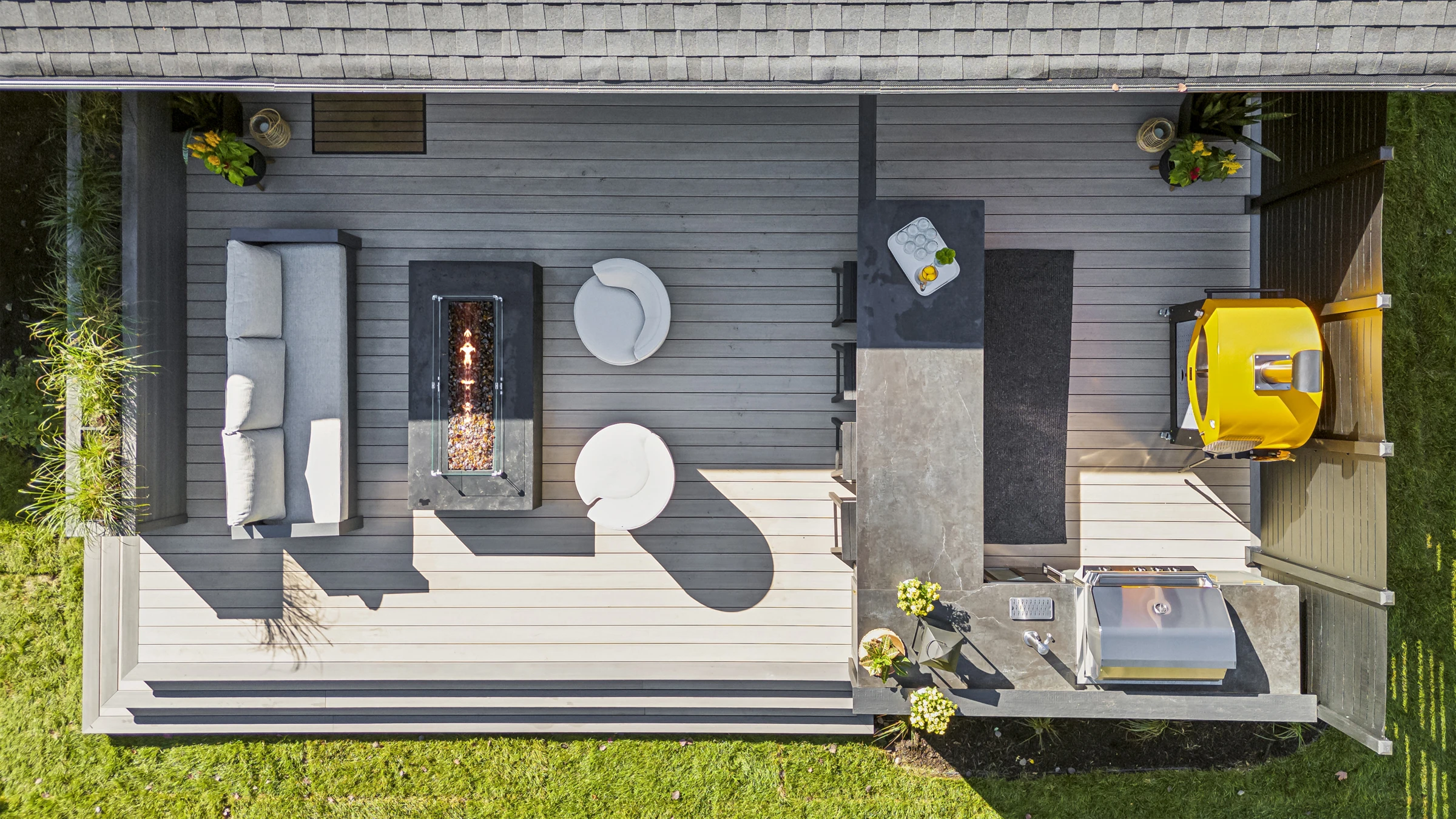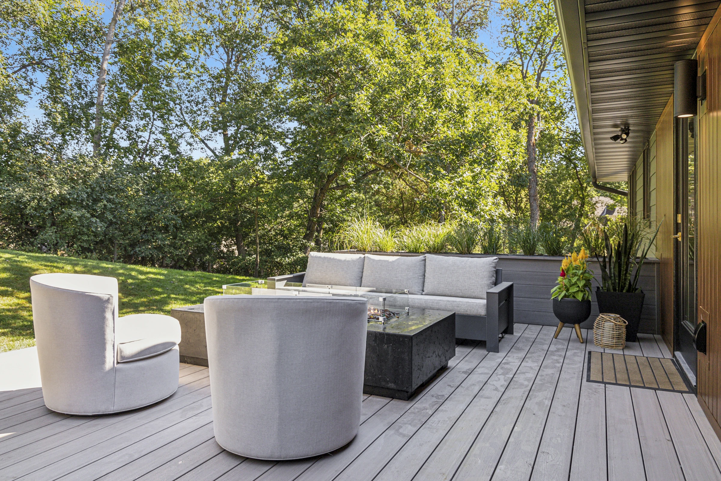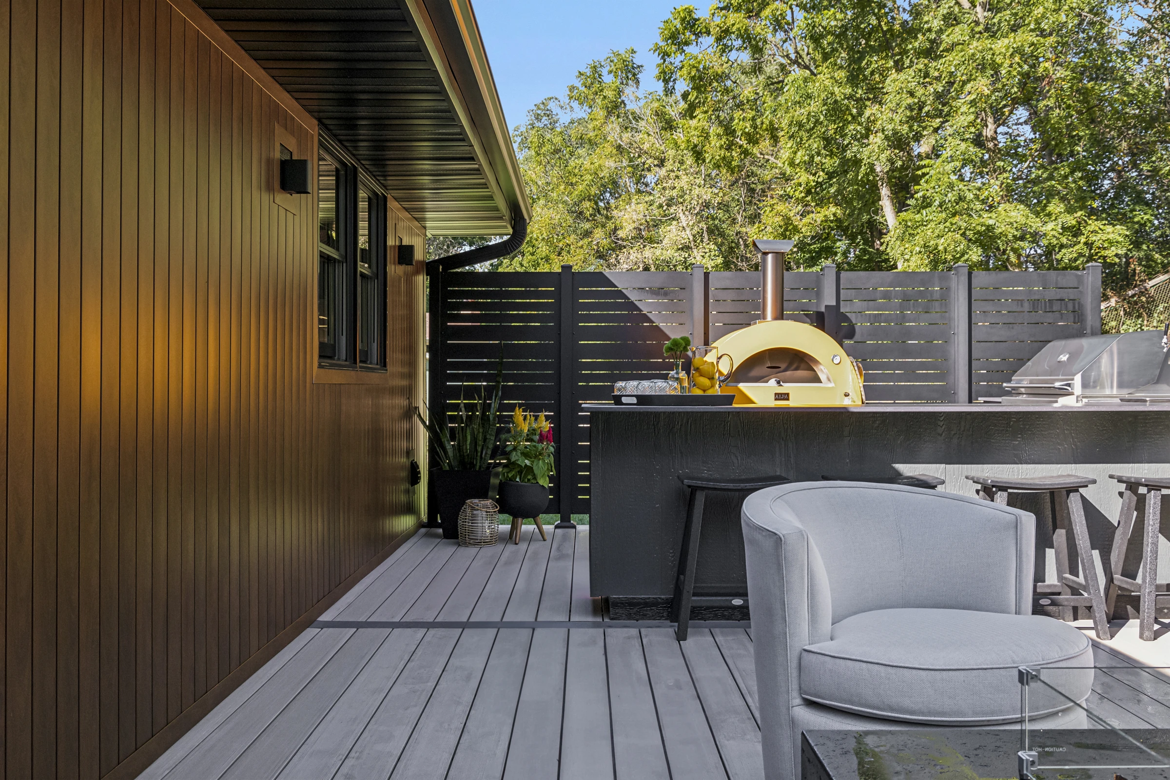 The deck renovation enhances the home’s connection to the outdoors, with easy flow from the kitchen to a beautifully designed outdoor space. The deck is built for year-round enjoyment, featuring Dekton countertops, which are UV-resistant and highly durable. It also boasts a Twin Eagles 42-inch grill, Alfa Moderno Pizza Oven, and a built-in kegorator, all elements that transform the deck into an ideal spot for outdoor entertaining.