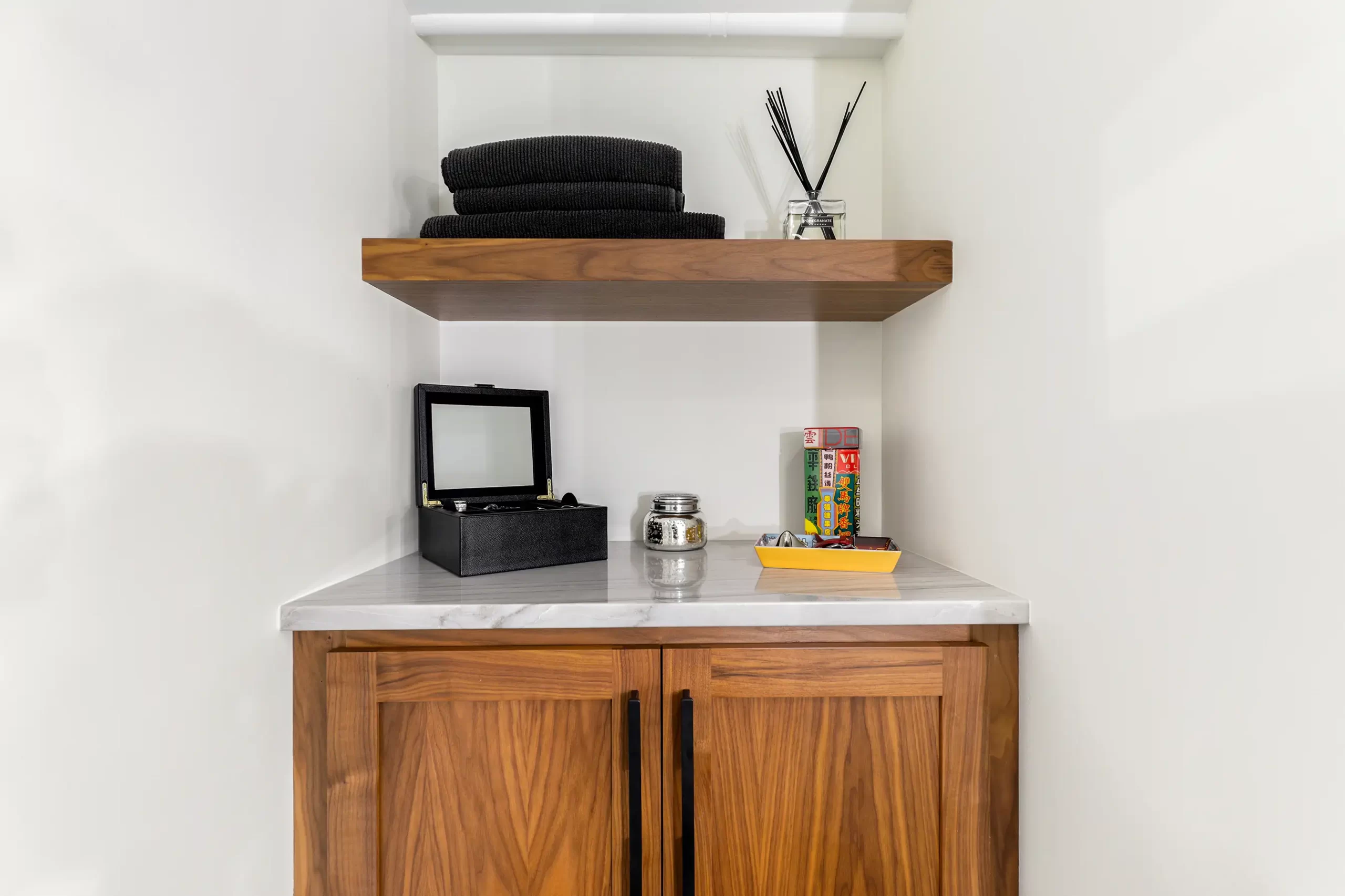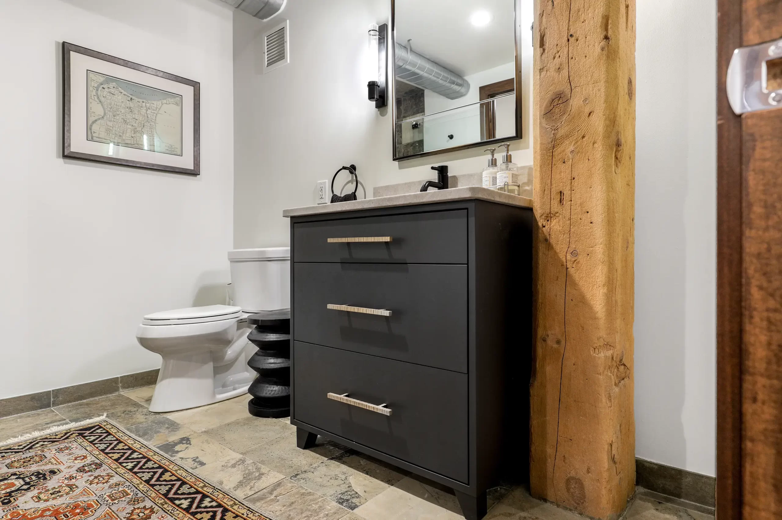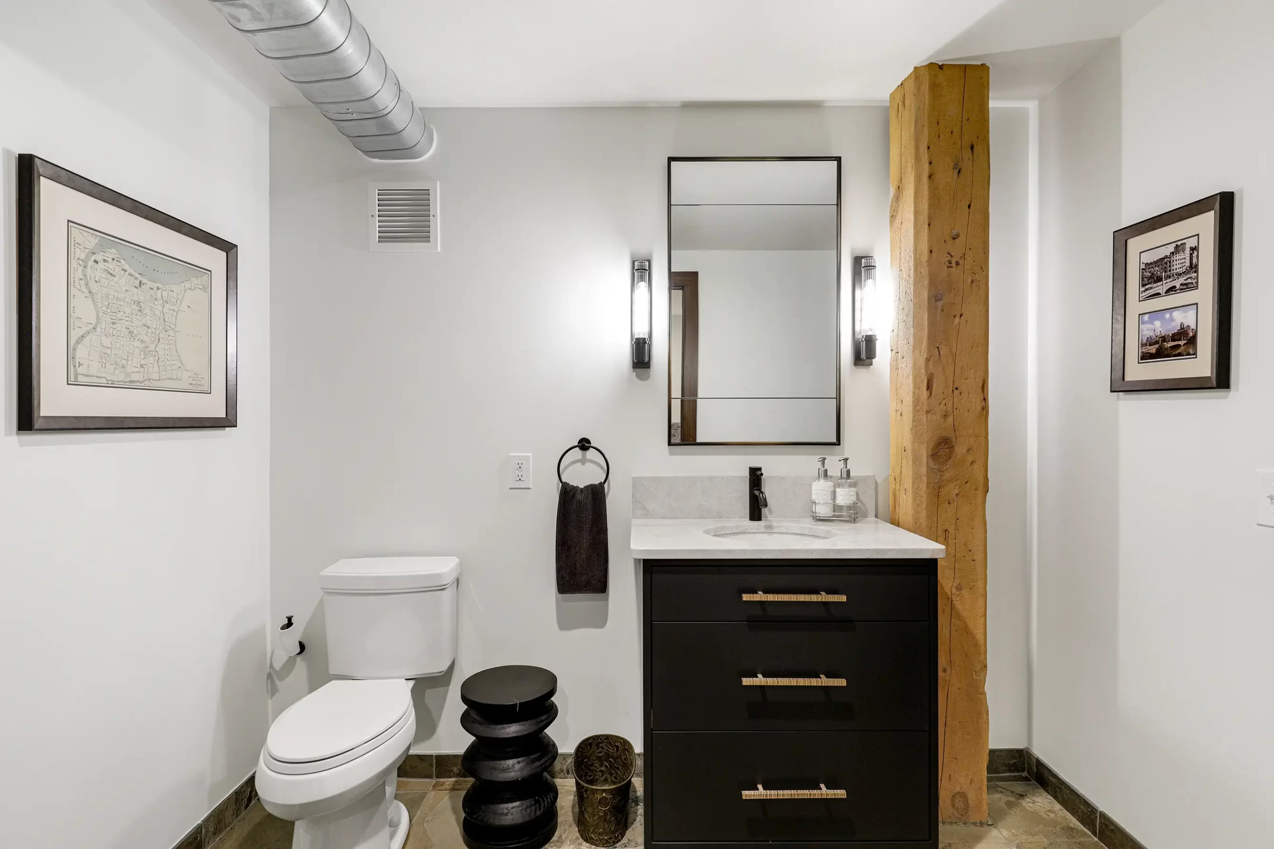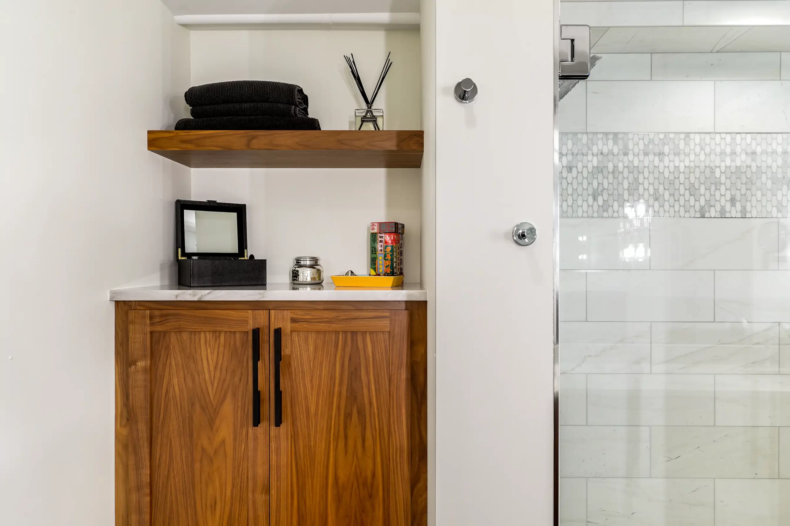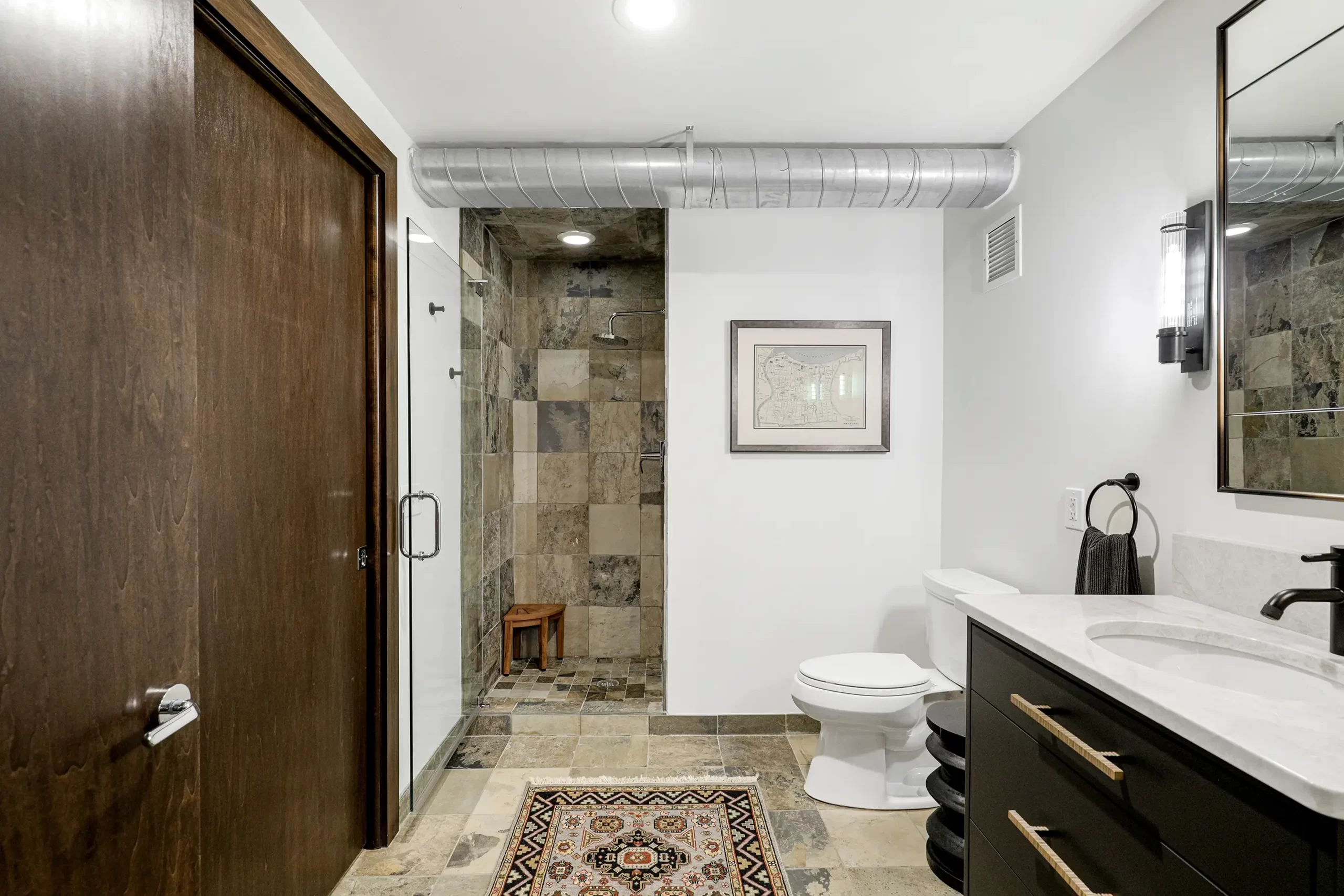 The lower level was transformed into a vibrant space for entertainment and relaxation. A sleek bar with black cabinetry and modern lighting offers the perfect setting for hosting. In the exercise room, a wood slat accent wall adds warmth and character. This level also includes a cozy living room, a guest bedroom, and an updated bathroom, creating a versatile area for family use.