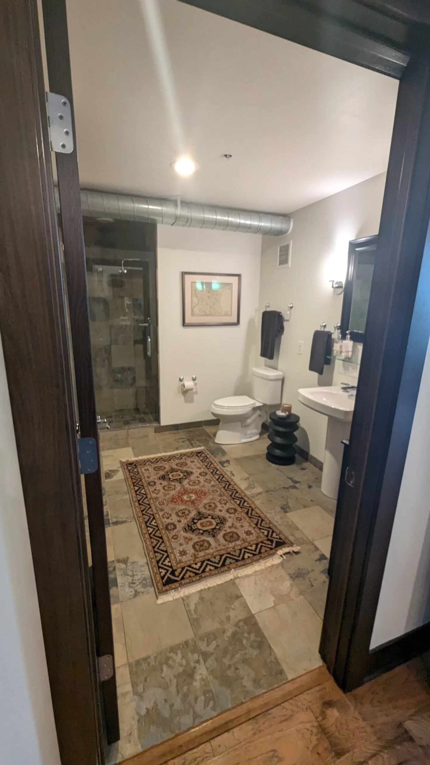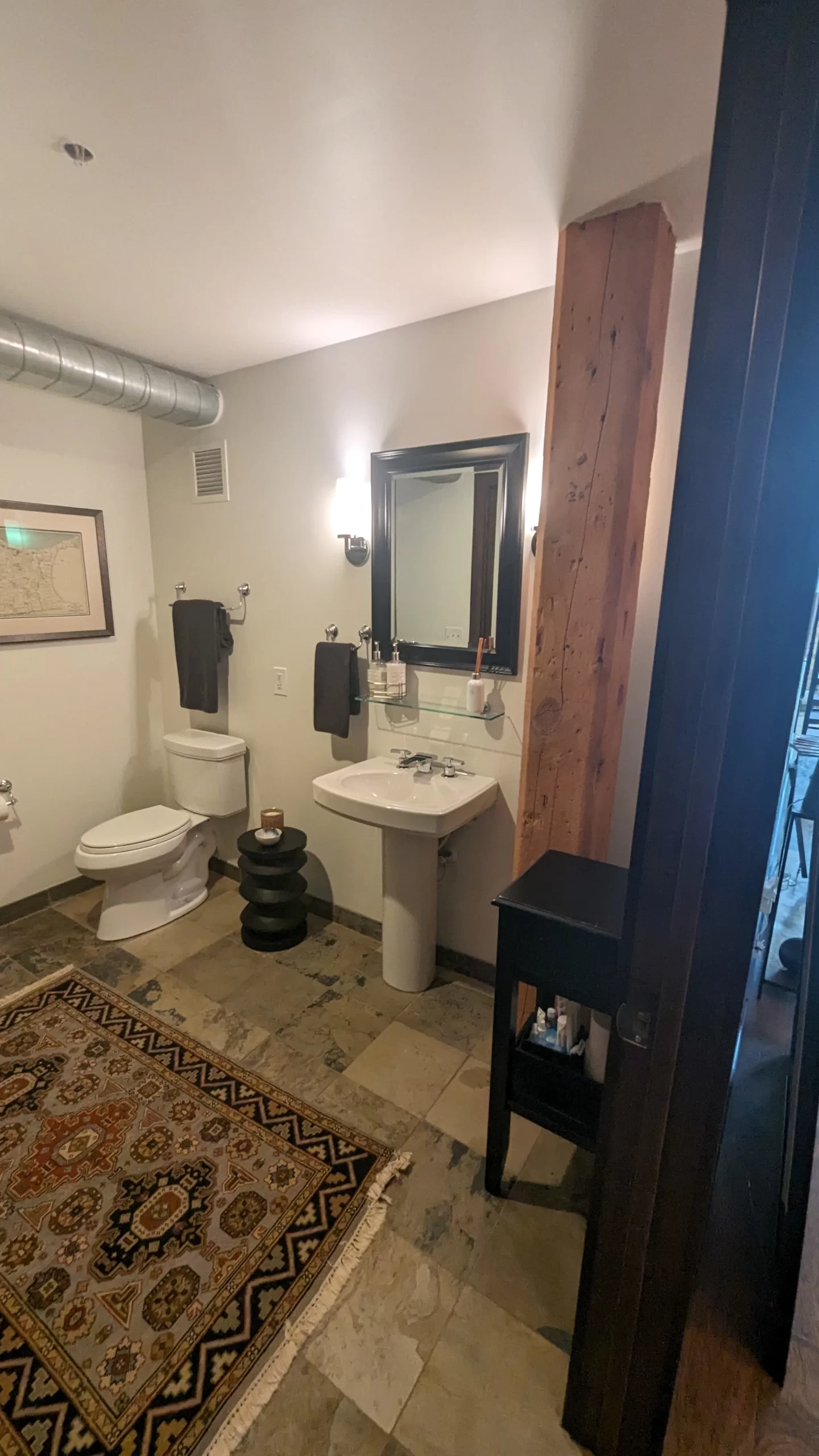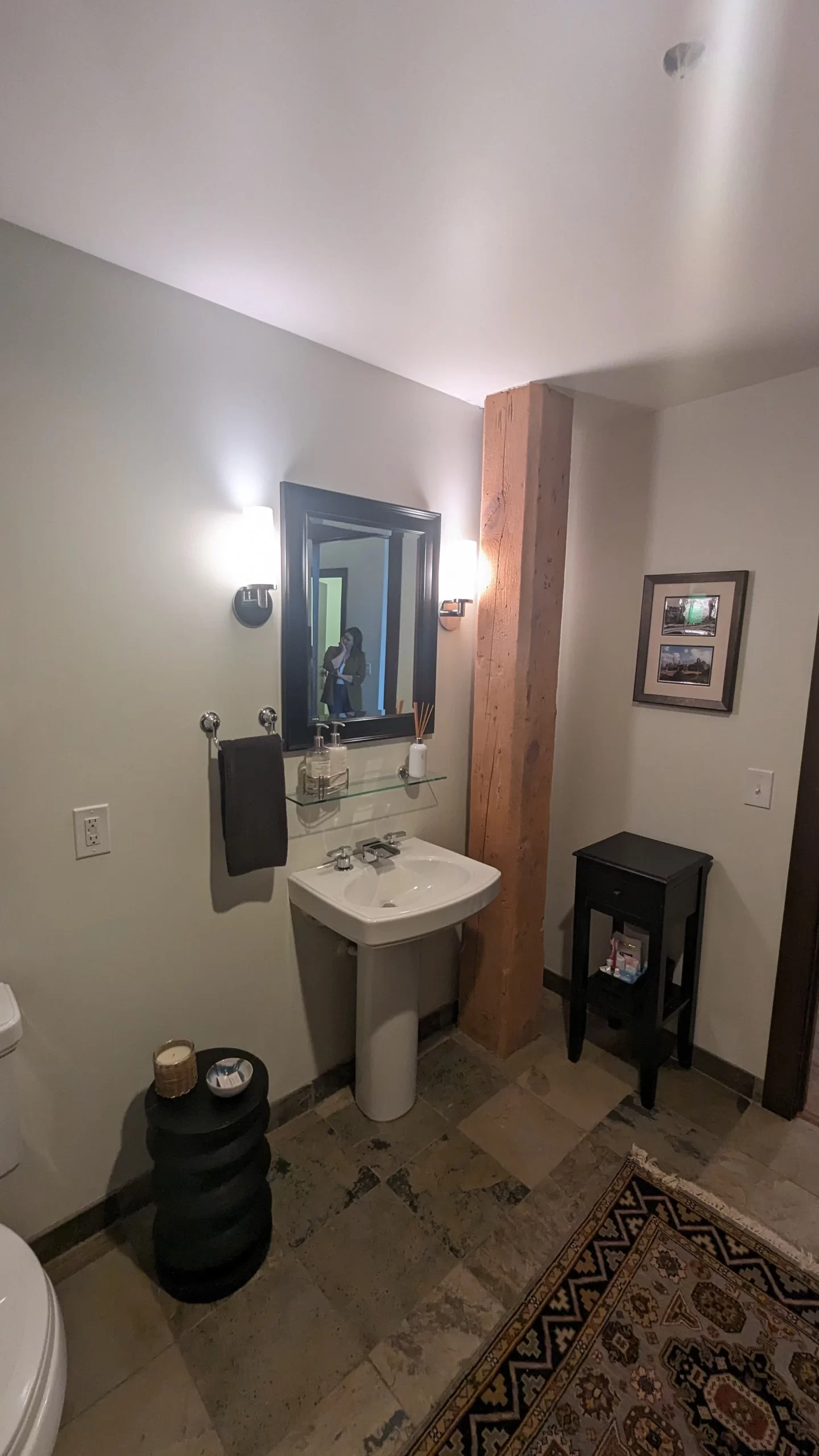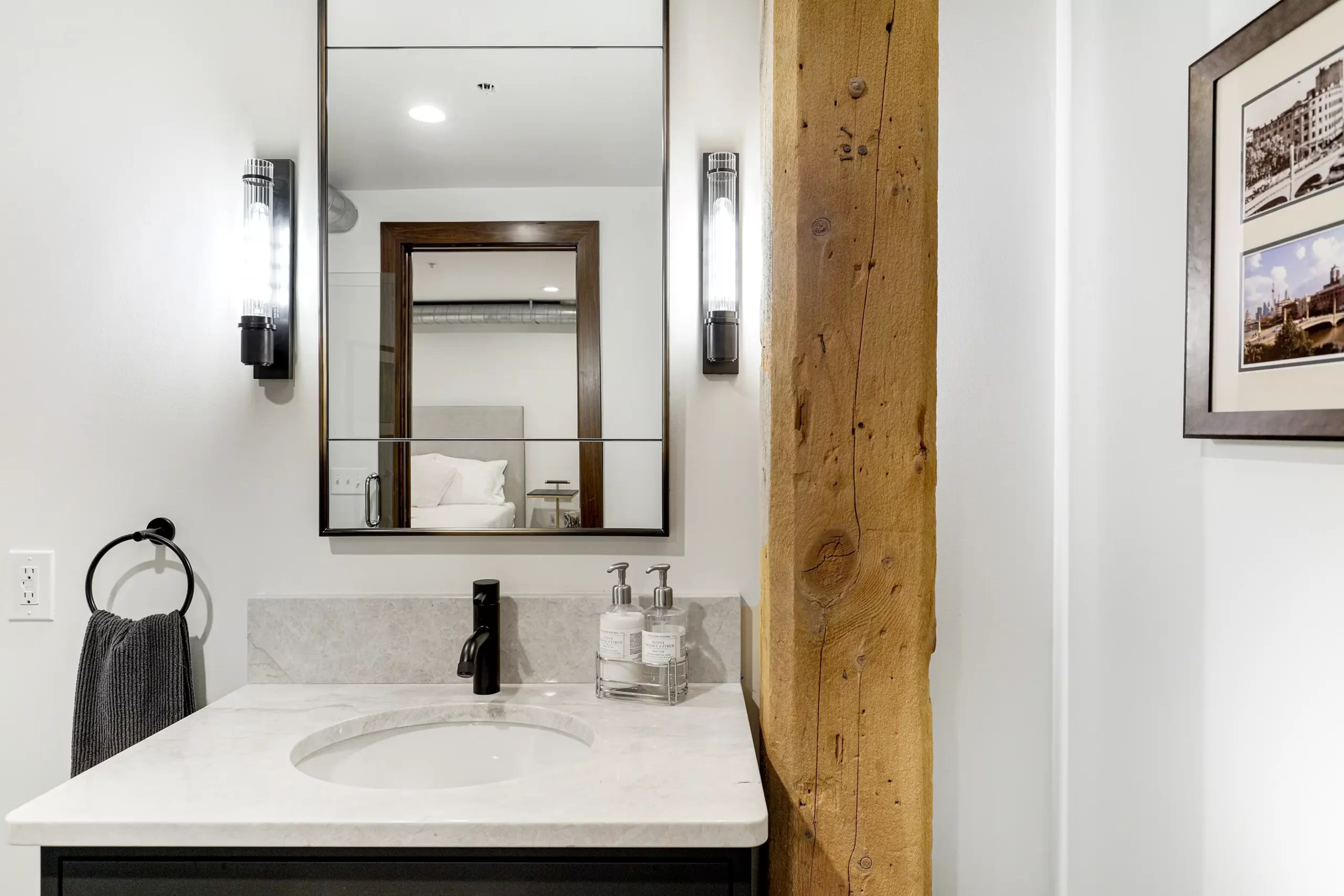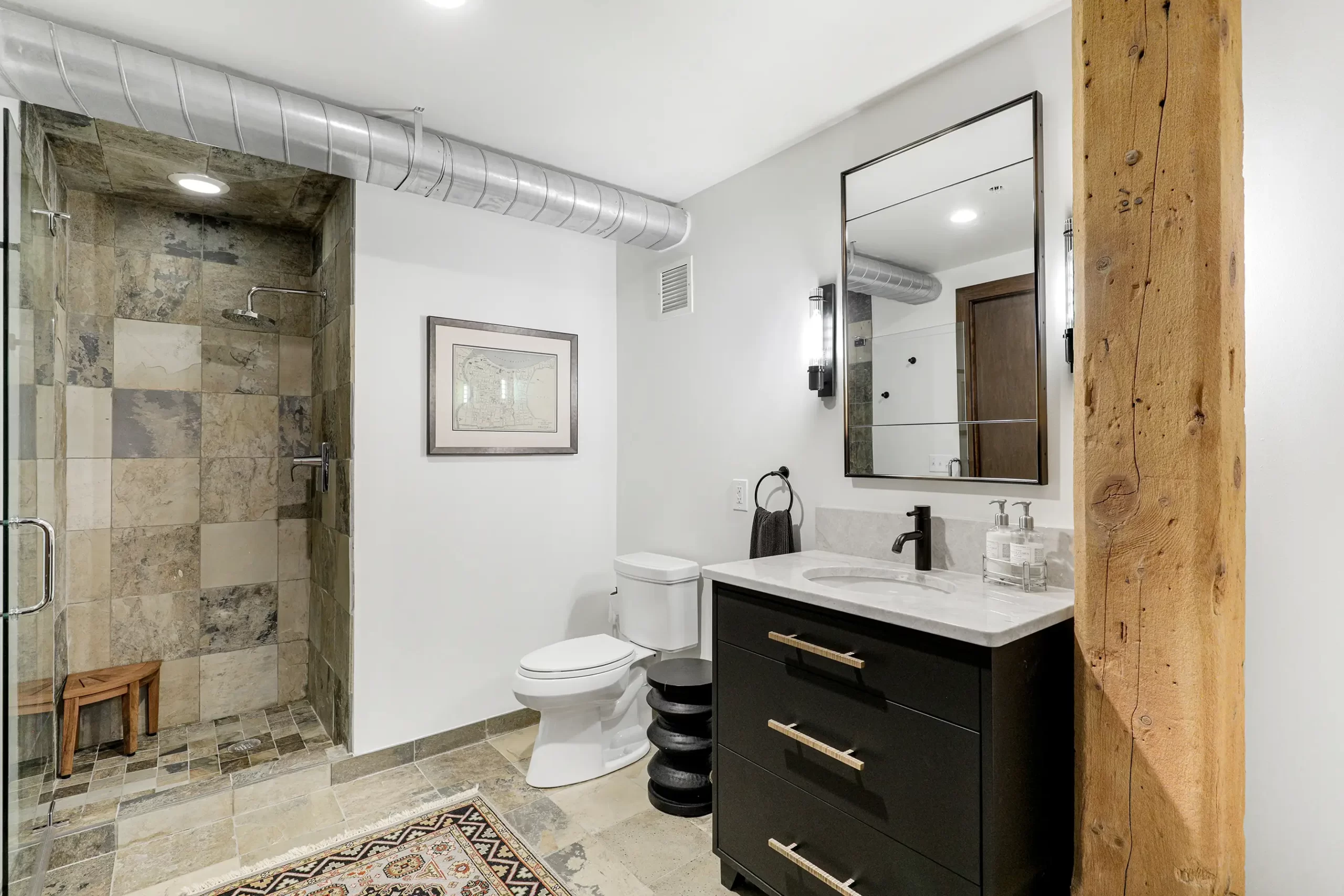 The lower level was transformed into a vibrant space for entertainment and relaxation. A sleek bar with black cabinetry and modern lighting offers the perfect setting for hosting. In the exercise room, a wood slat accent wall adds warmth and character. This level also includes a cozy living room, a guest bedroom, and an updated bathroom, creating a versatile area for family use.