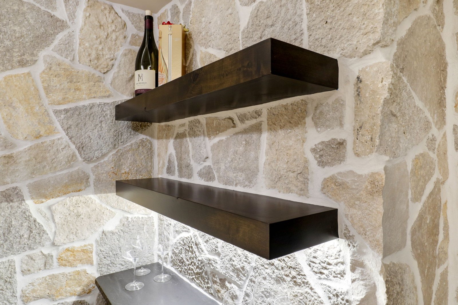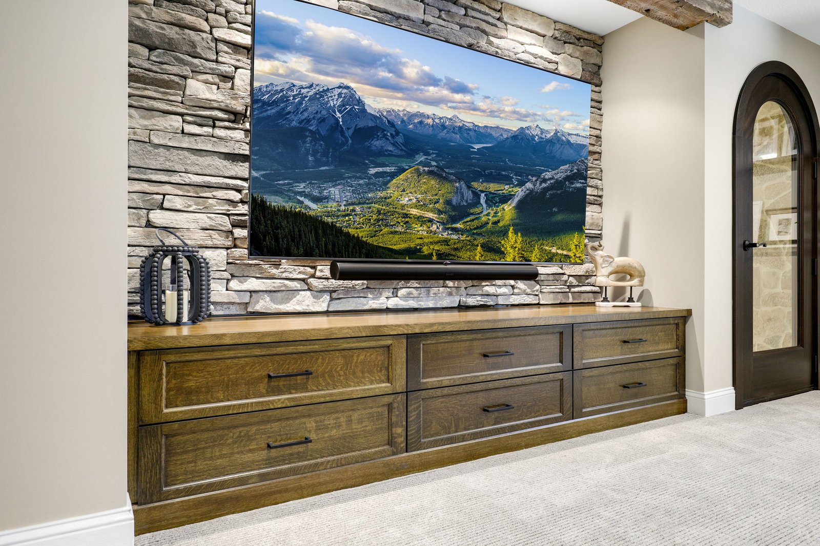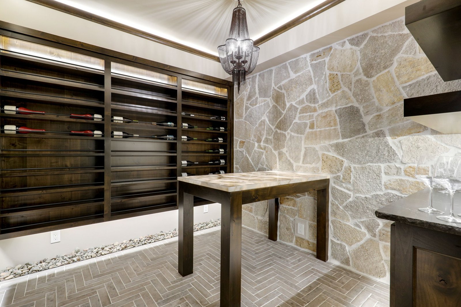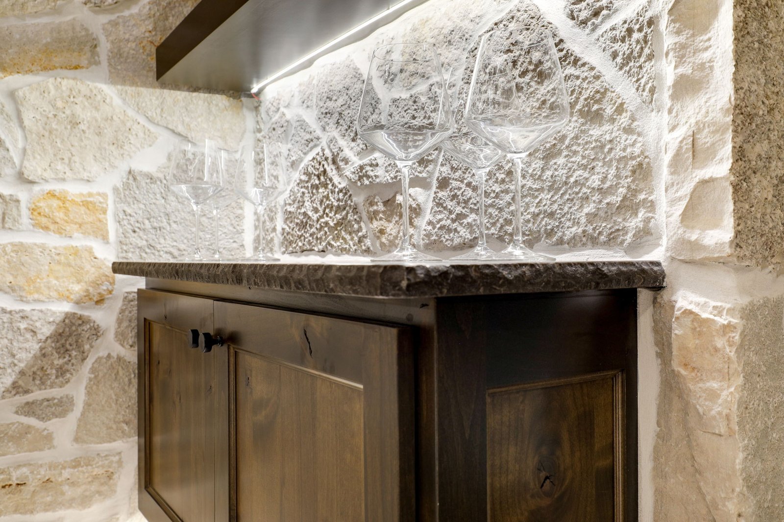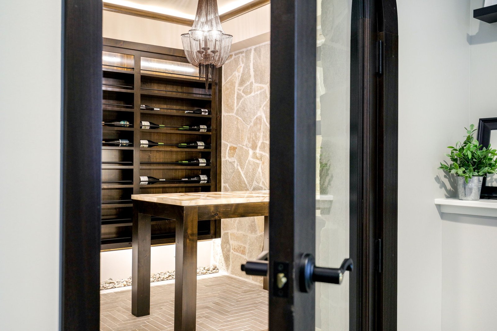 The renovation focused on more than just functionality. We infused the space with an ‘old world’ charm, incorporating rich wood tones, a stone web wall, and brick-style herringbone tiles. Additionally, a custom arched wine door helps regulate the room’s temperature while enhancing the historic feel. Modern lighting features were thoughtfully integrated, allowing the ambiance to be adjusted for any occasion. The result is a luxurious retreat within the home.