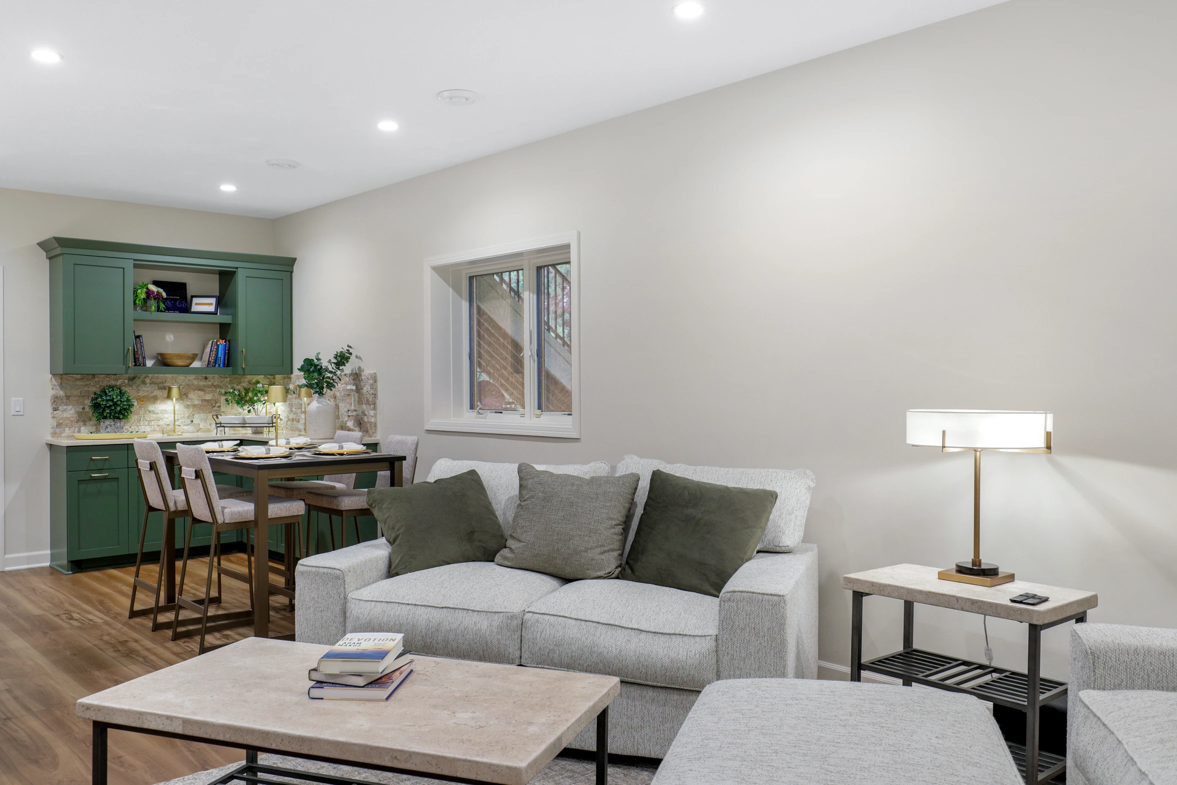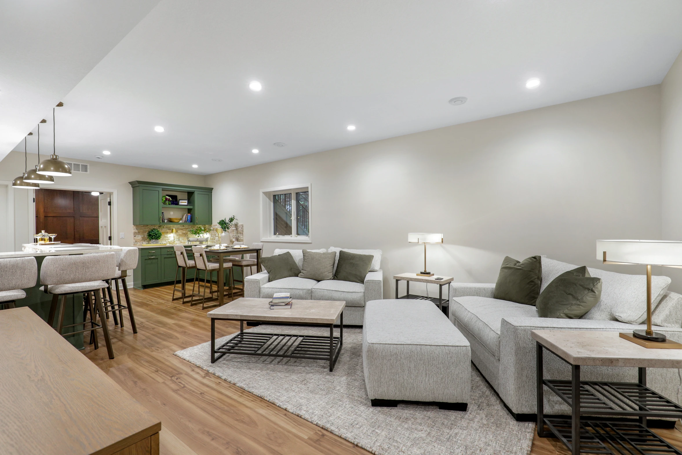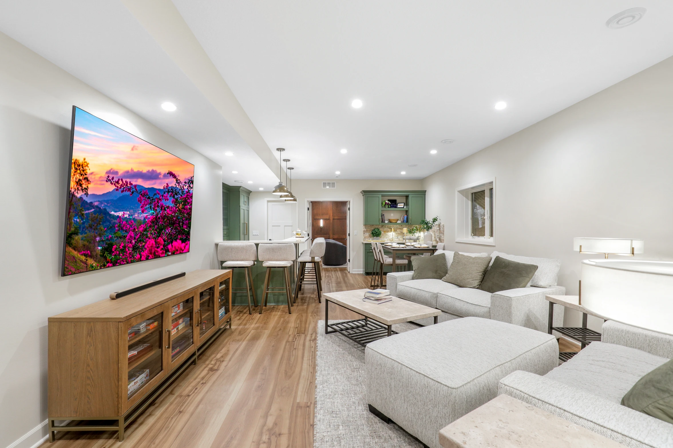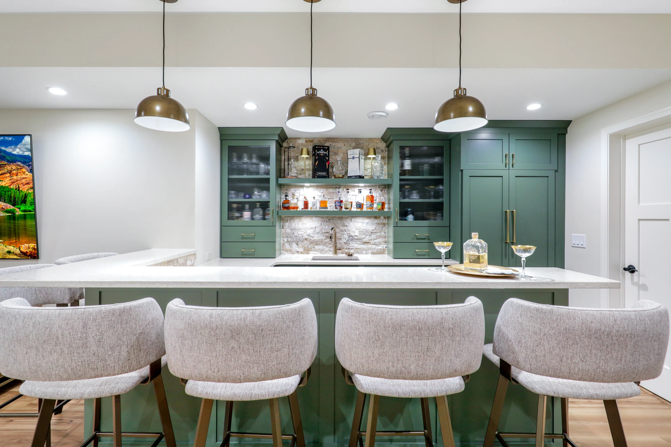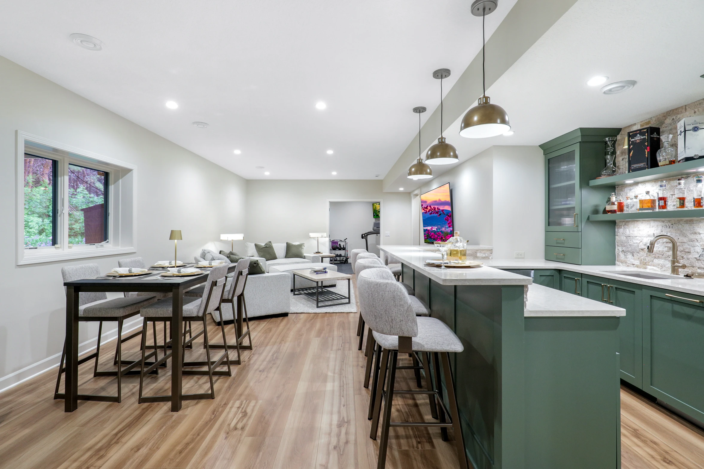 Next, the family room was created to be a cozy yet sophisticated space for relaxation, with comfortable seating, ambient lighting, and modern design elements. Adjacent to it, the wet bar serves as a focal point for entertaining. Equipped with sleek countertops, stylish cabinetry, and all the necessary amenities, it’s a perfect spot for crafting cocktails.