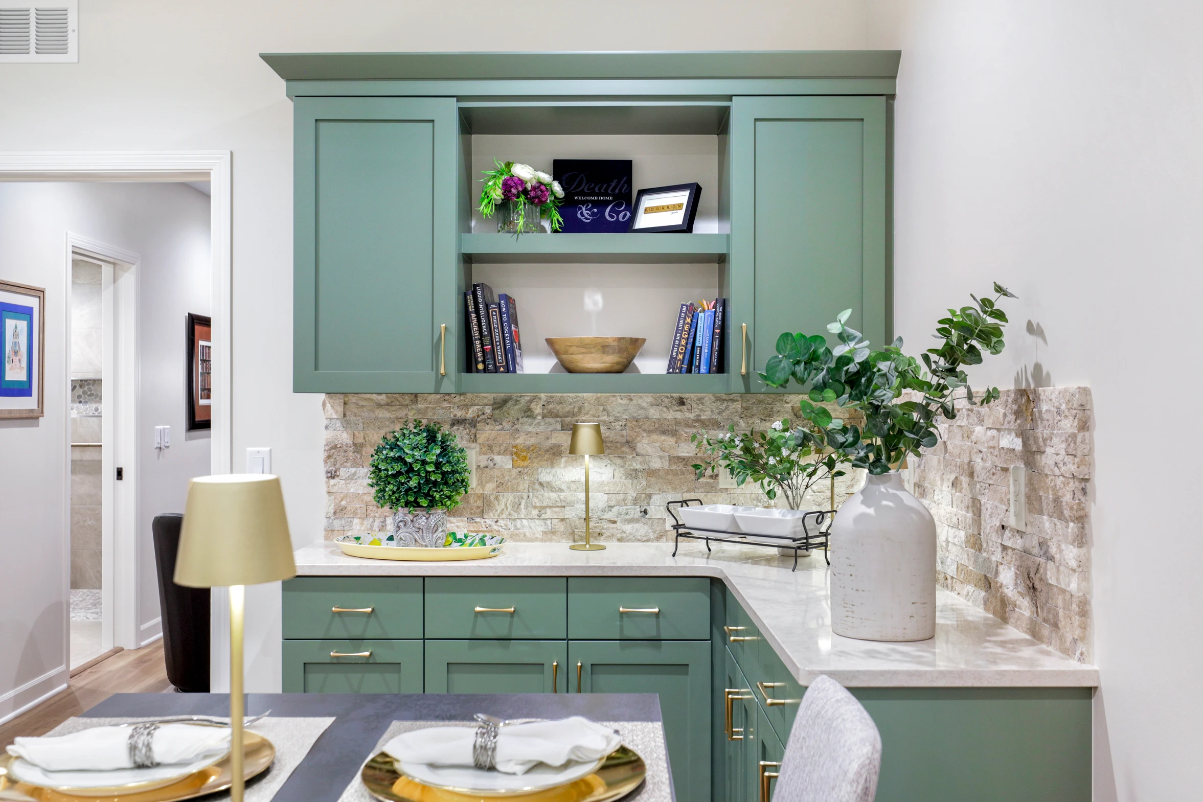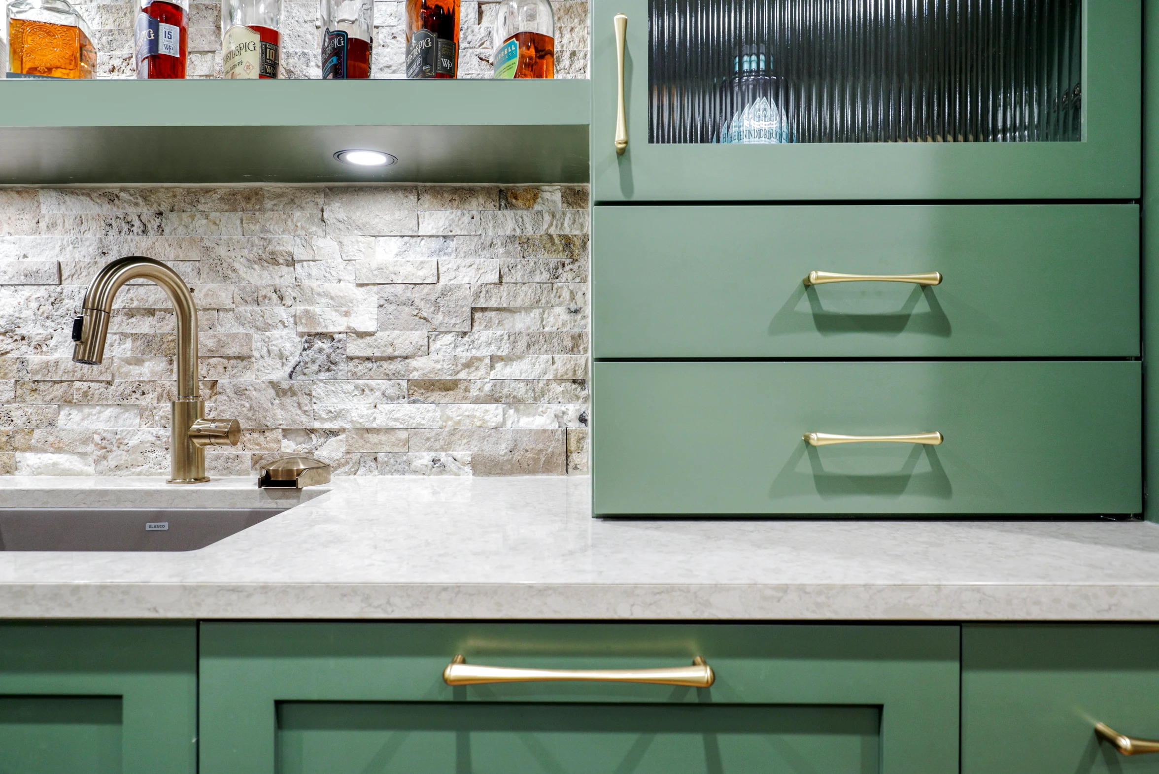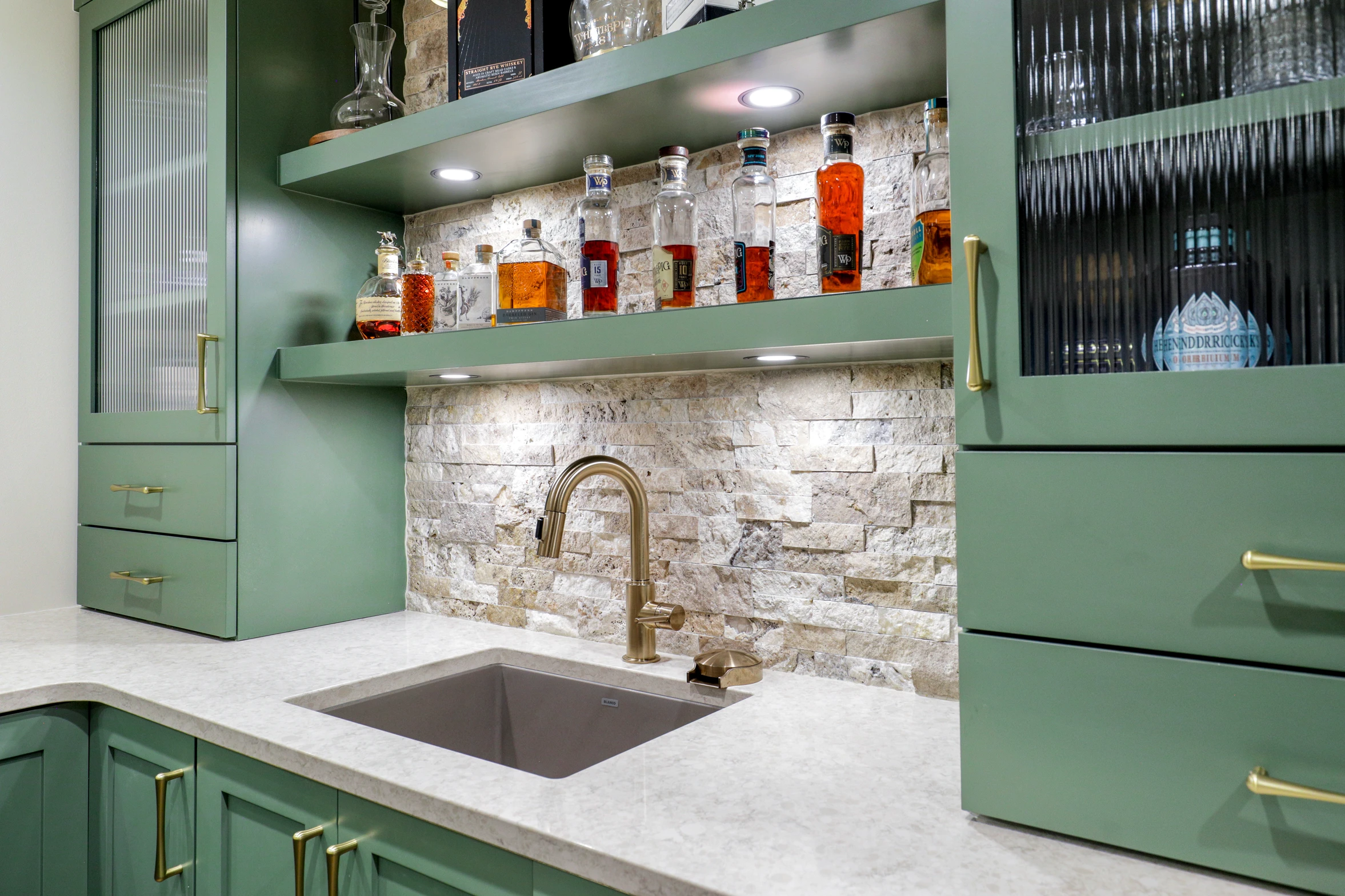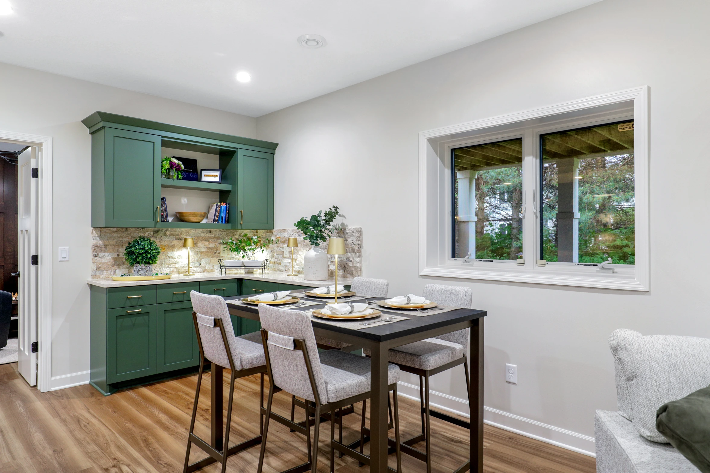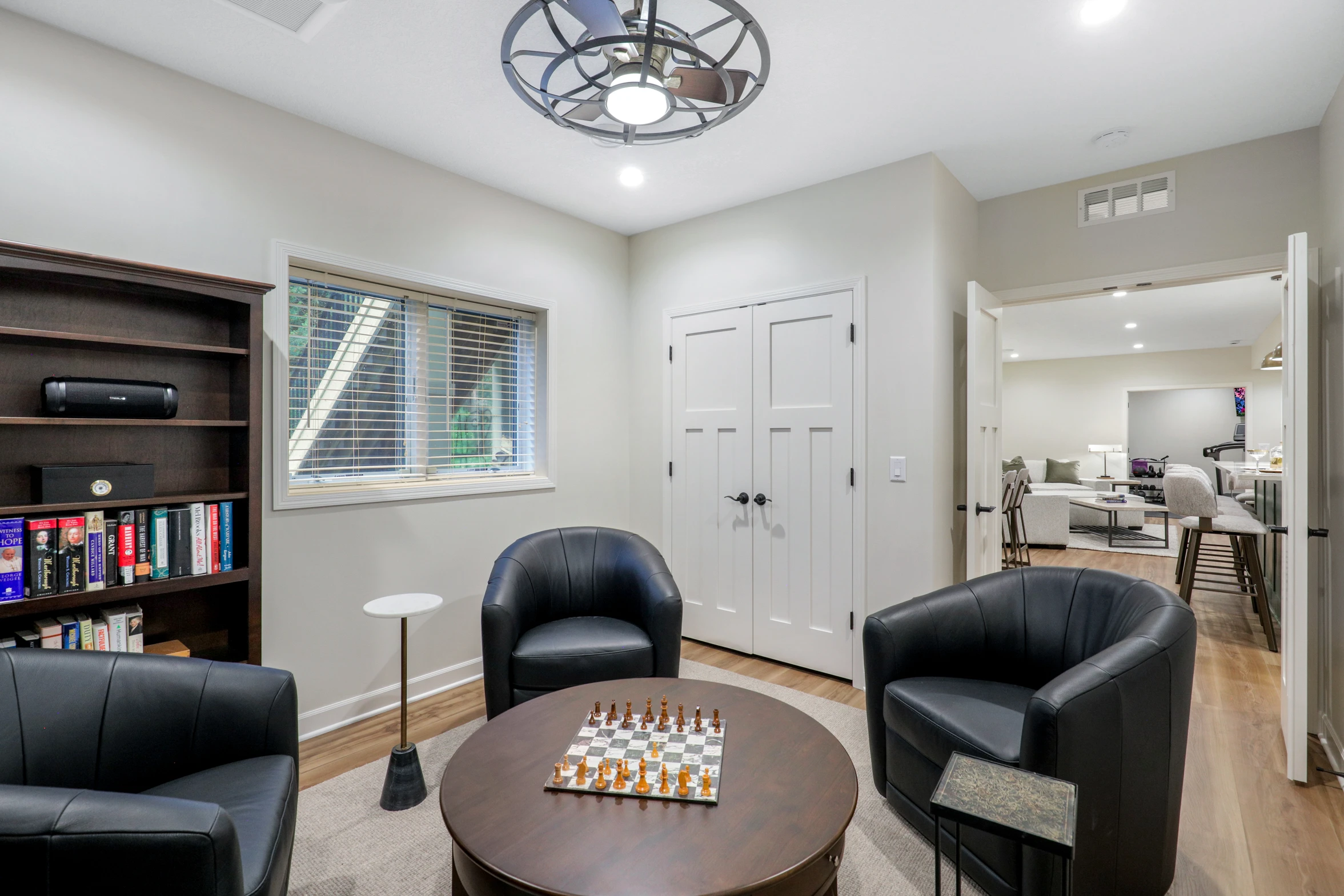 Next, the family room was created to be a cozy yet sophisticated space for relaxation, with comfortable seating, ambient lighting, and modern design elements. Adjacent to it, the wet bar serves as a focal point for entertaining. Equipped with sleek countertops, stylish cabinetry, and all the necessary amenities, it’s a perfect spot for crafting cocktails.