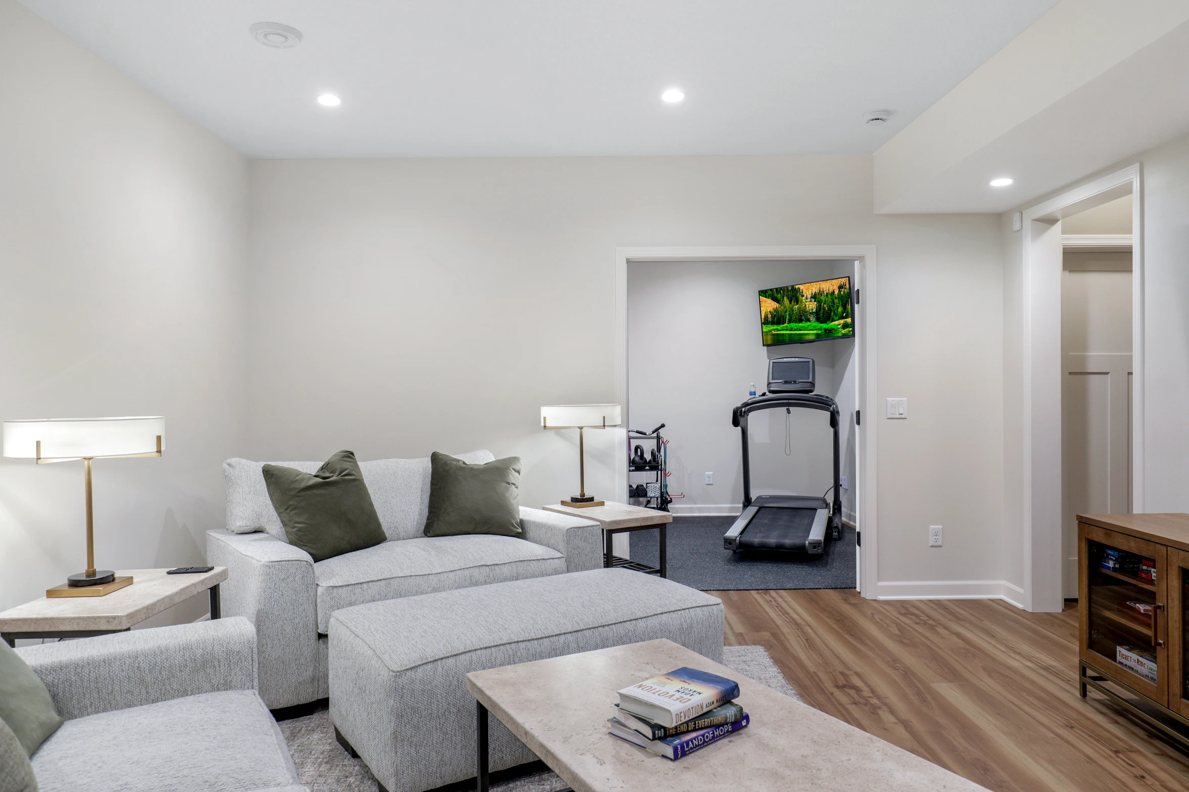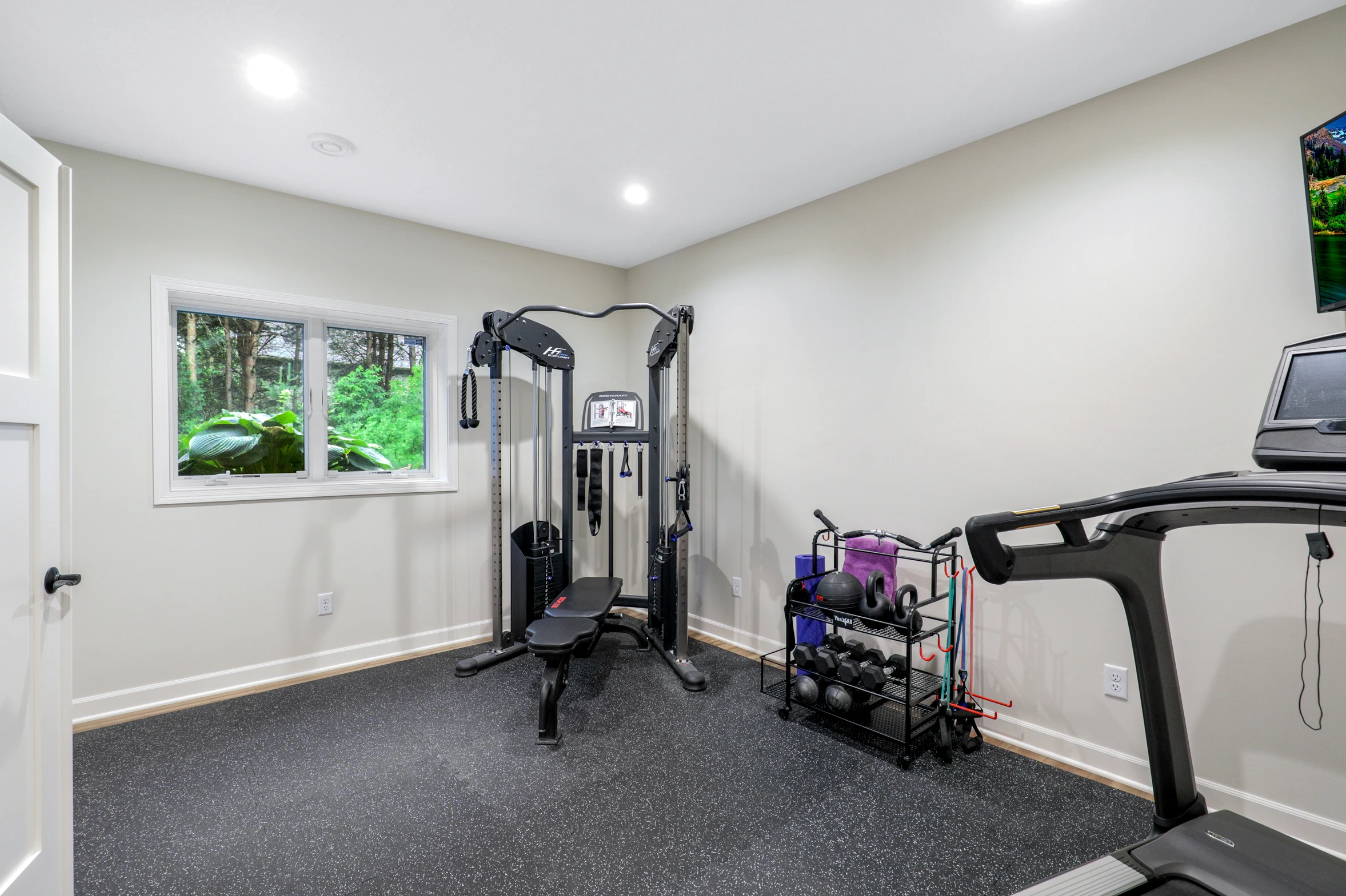 The renovation began with framing new walls to define distinct areas, ensuring each space had its own purpose. The new exercise room was designed to provide a motivating environment for workouts, featuring high-quality flooring, ample lighting, and space for equipment.
